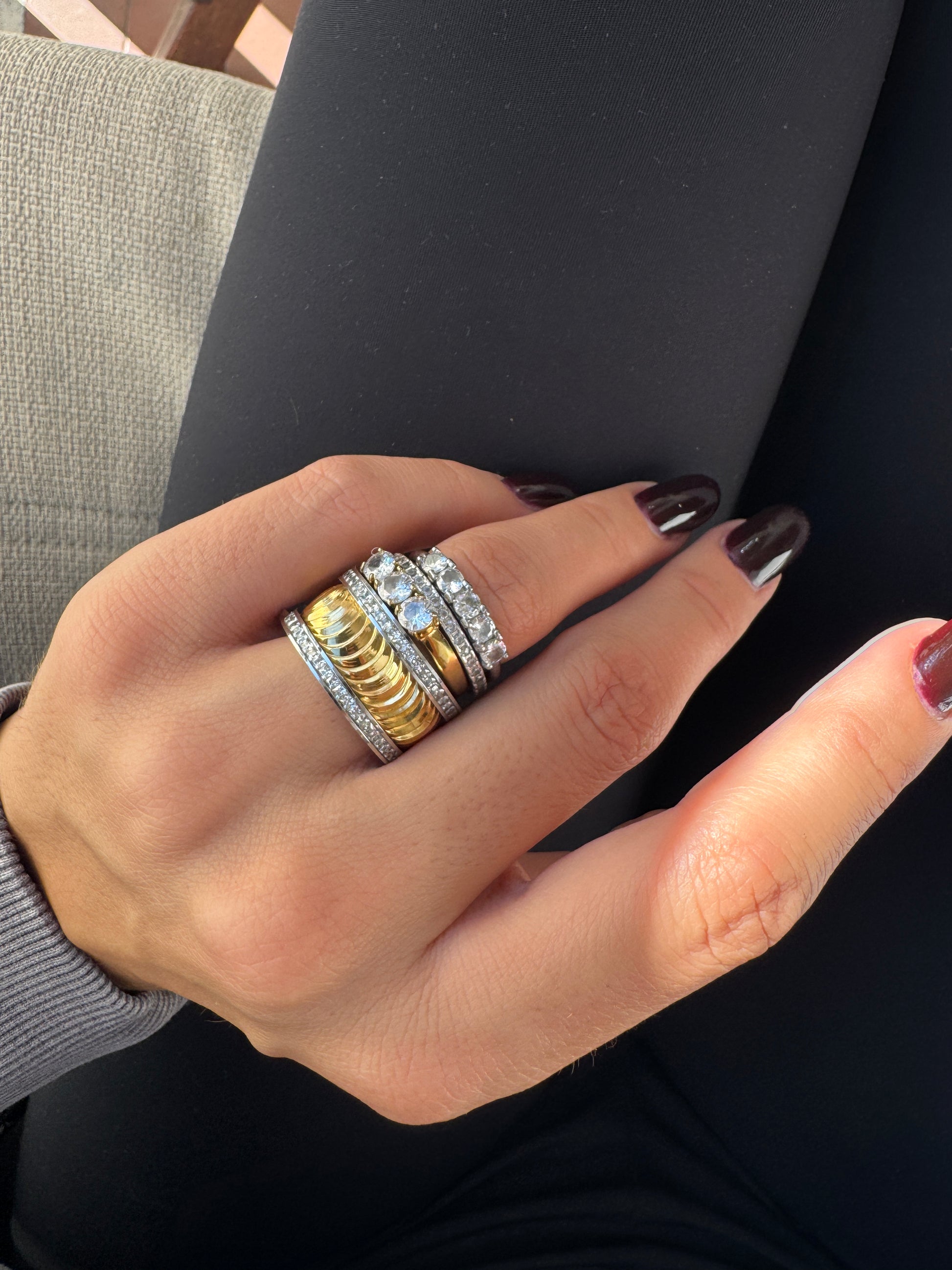 Anello a fascia bicolore realizzato in acciaio inox anallergico. La struttura centrale è in finitura dorata con motivo rigato, che dona movimento e luminosità. I bordi, invece, sono in acciaio lucido color argento con un delicato dettaglio decorativo che incornicia la fascia centrale.