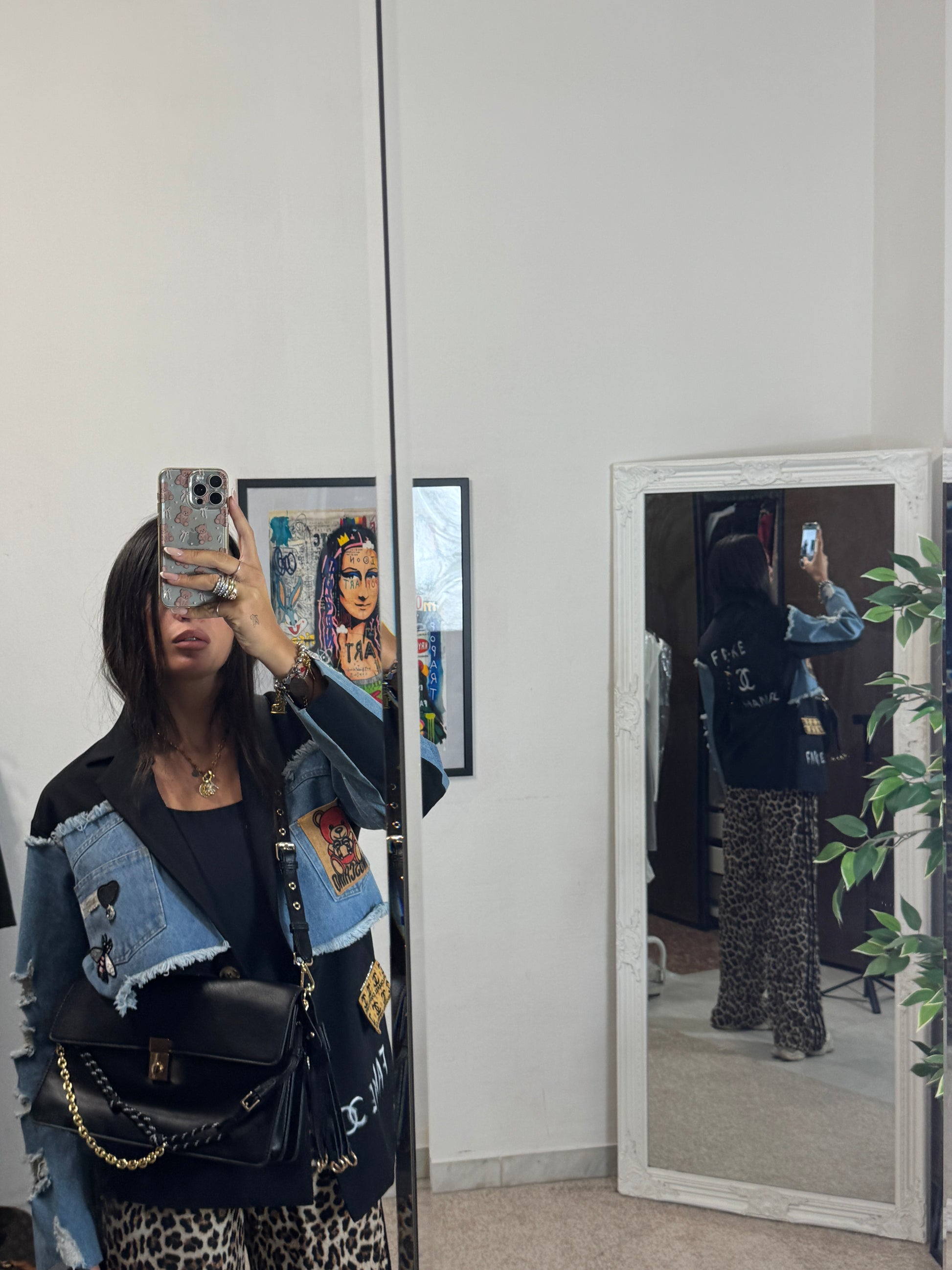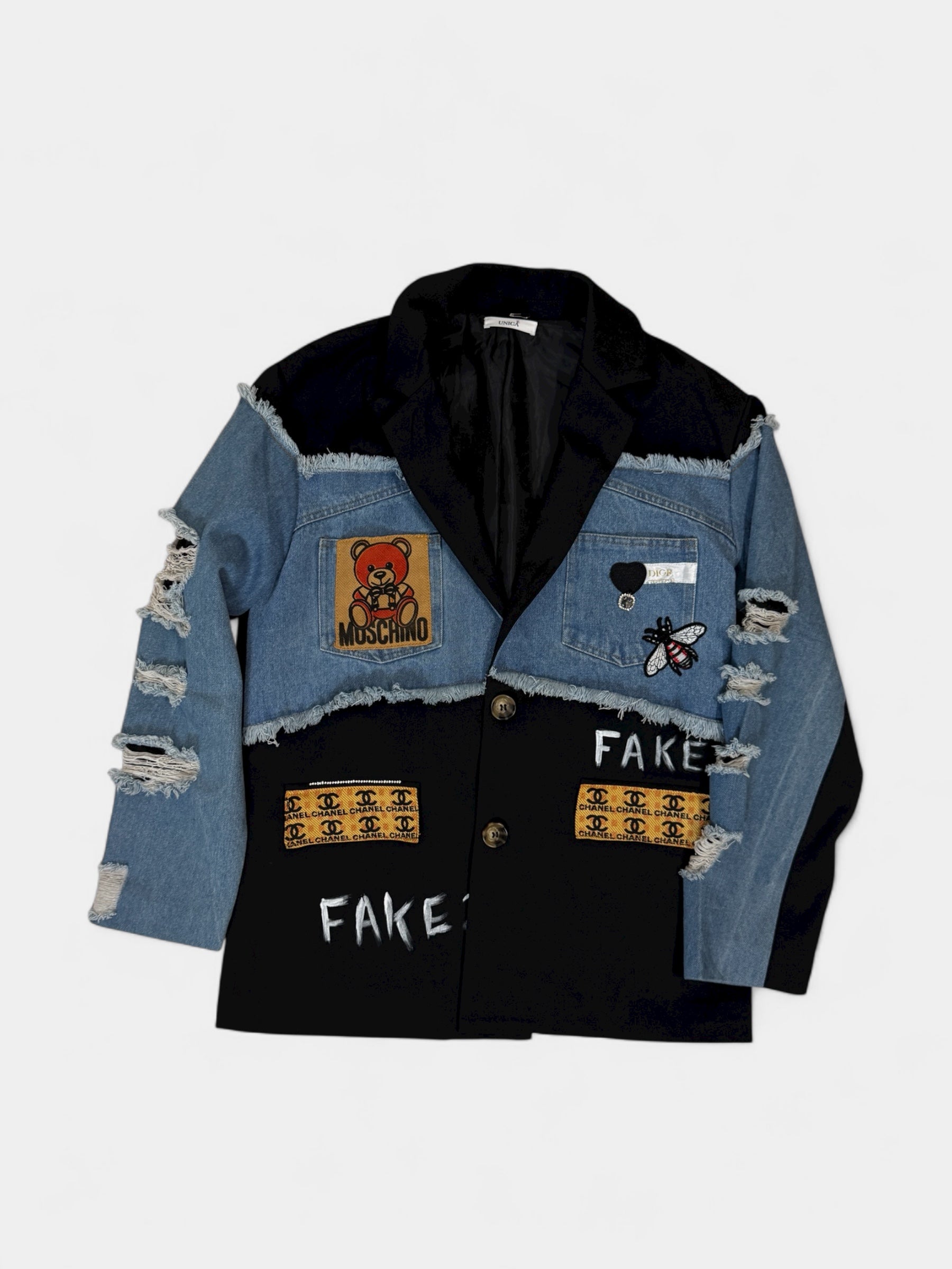 Questo blazer ha un’anima molto particolare: un mix di denim e tessuto elegante, dettagli patch e scritte “FAKE CHANEL” che lo rendono ironico, provocatorio e street.
