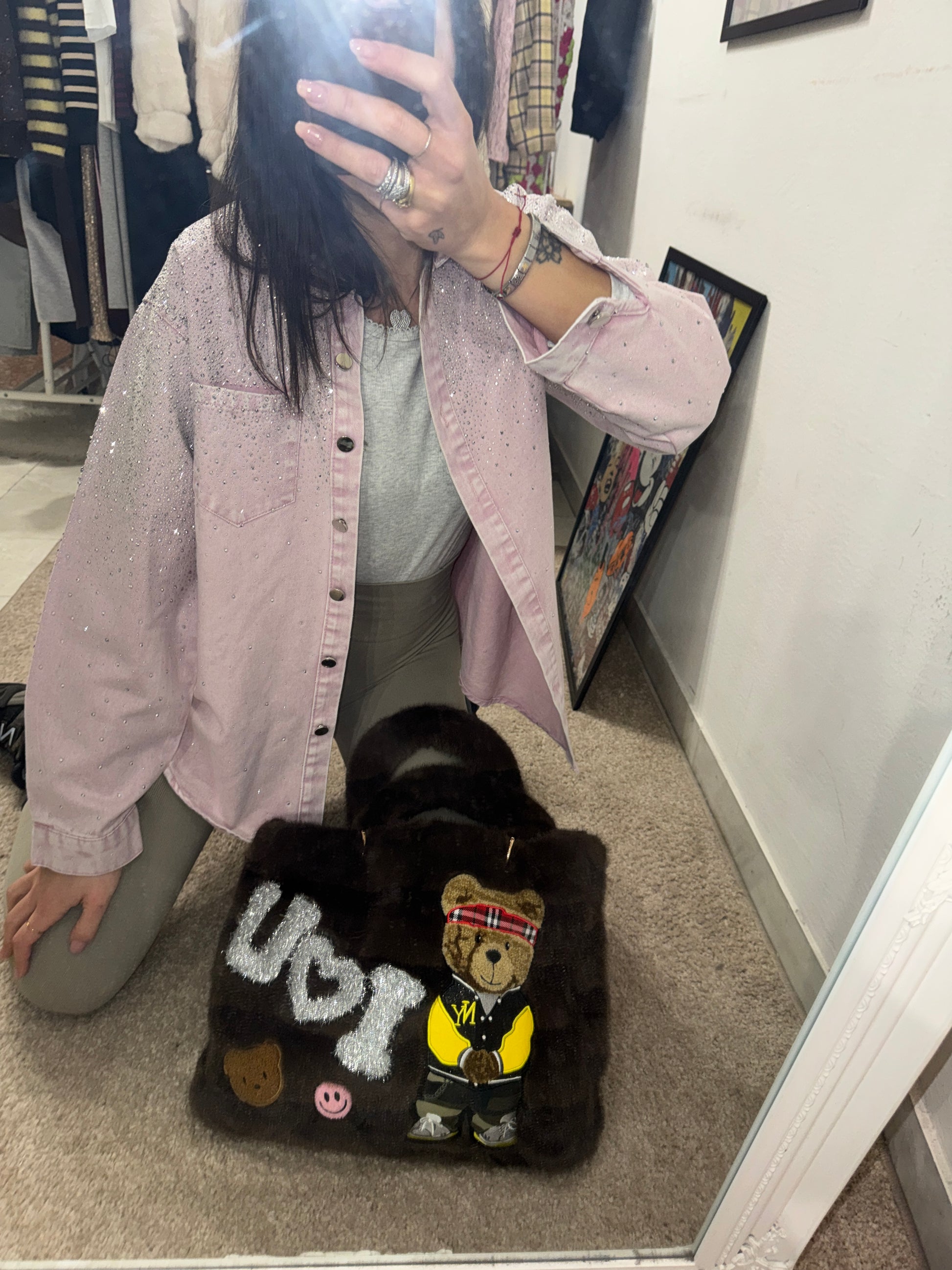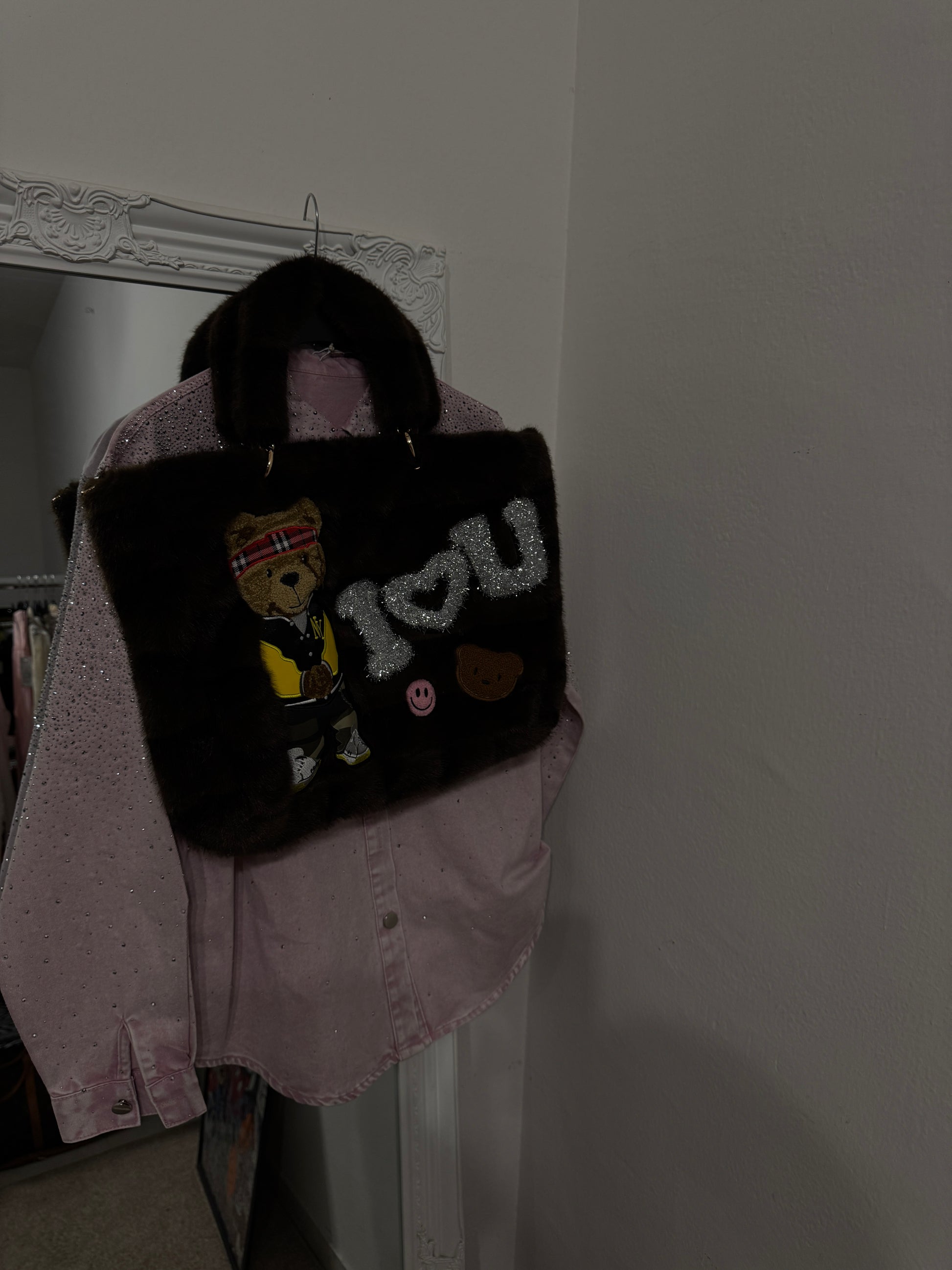 Borsa in eco-pelliccia marrone, morbida e avvolgente, con manico strutturato rivestito nello stesso materiale.
