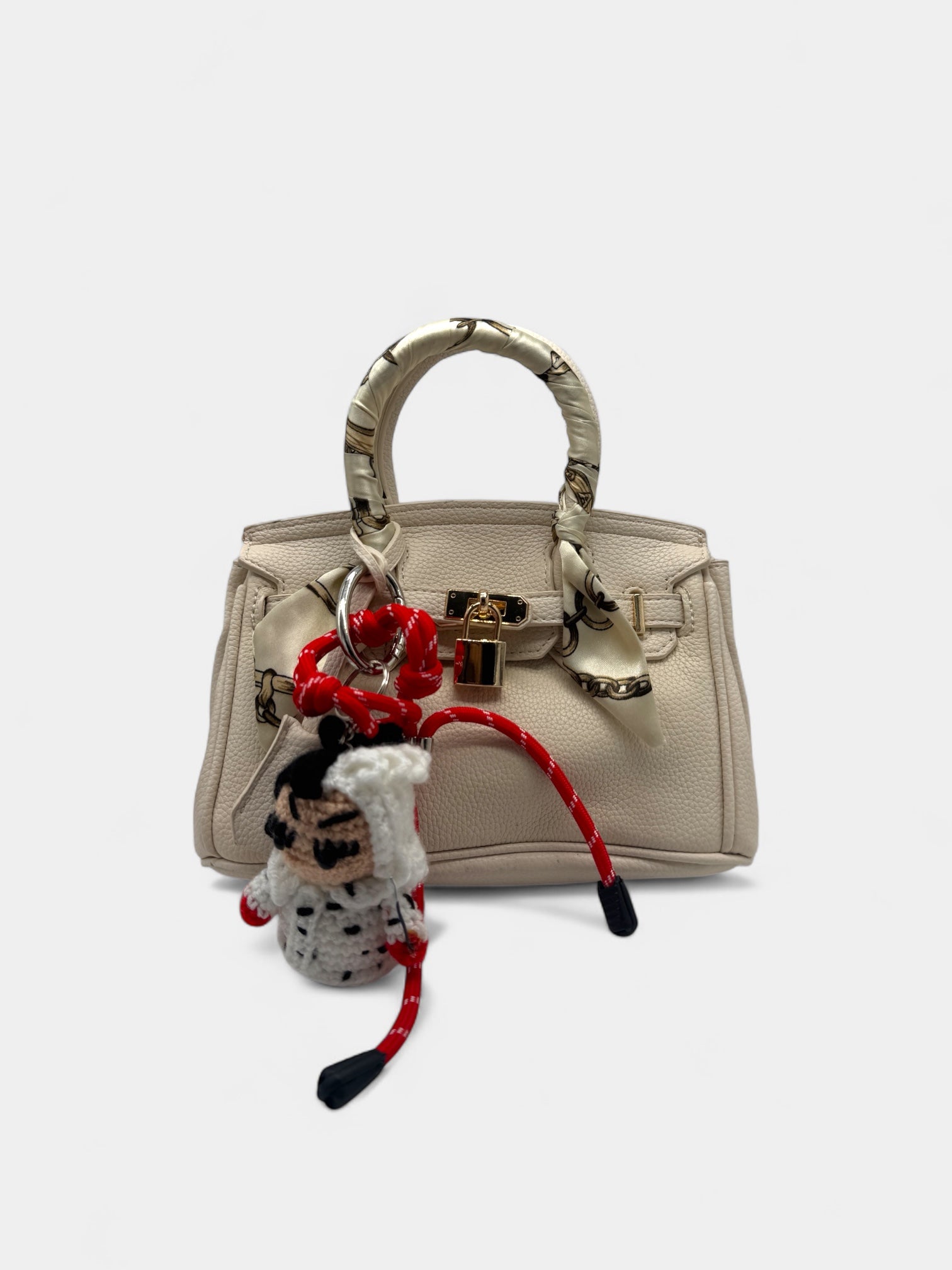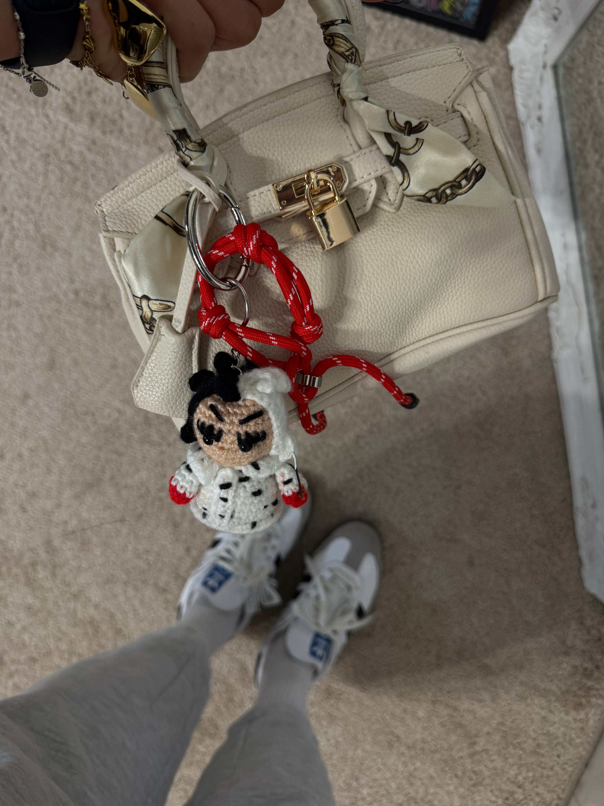 La particolarità è data dal portachiavi handmade in crochet ispirato a Crudelia De Mon, abbinato a un cordino rosso che dona un contrasto vivace e moderno al design classico della borsa.