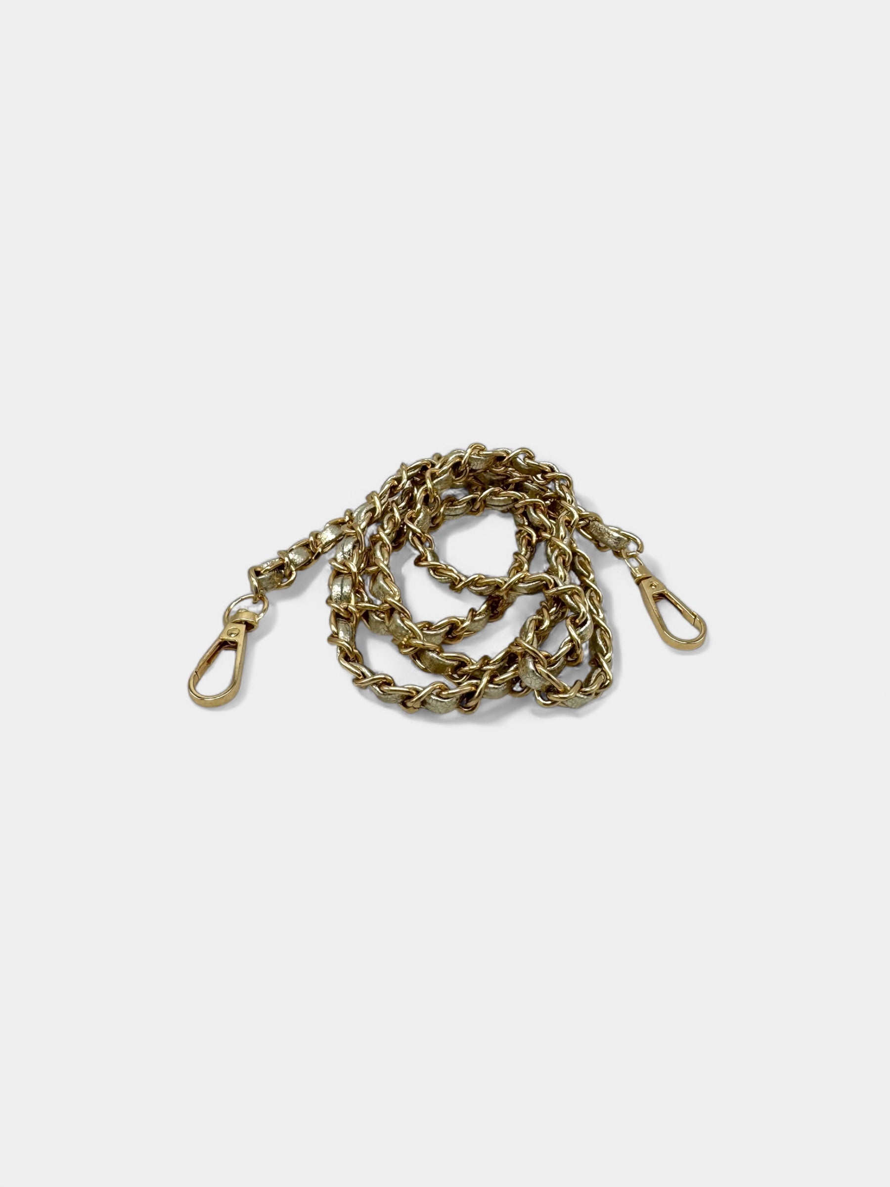 I manici corti, rivestiti in materiale metallizzato oro, le donano un tocco deciso e sofisticato. Il dettaglio che cattura subito lo sguardo è la catena frontale in oro con charms pendenti.