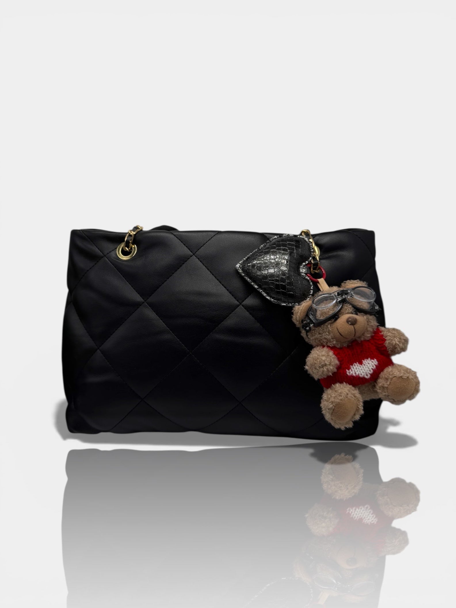 il cuore rosso applicato, simbolo di amore e passione, e il Teddy pendente, tenero e iconico, che racconta un lato più giocoso, affettuoso e personale. Un contrasto perfetto tra romanticismo e grinta.