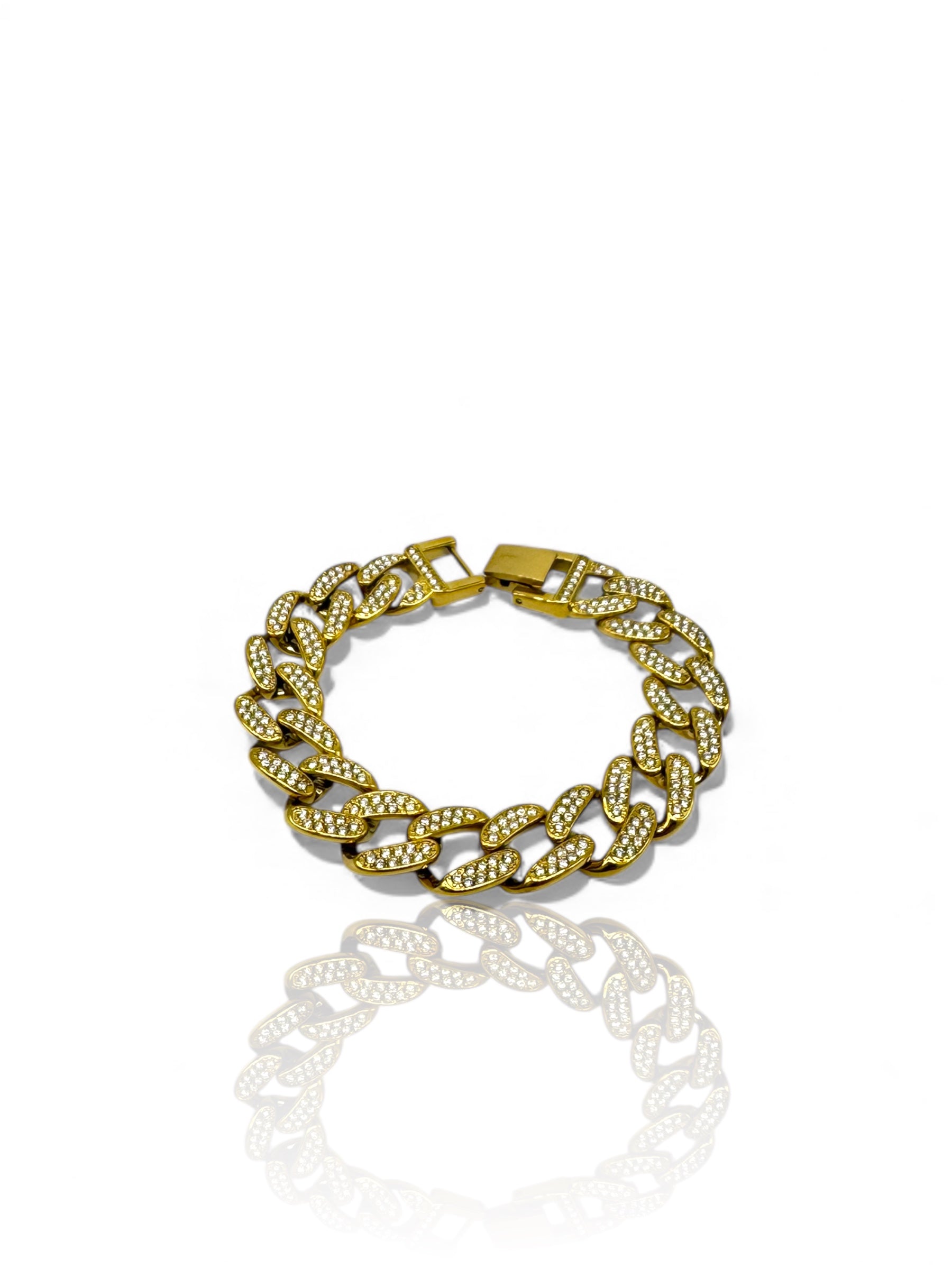 Il design a maxi maglie dorate, impreziosite da cristalli incastonati, rende questo bracciale la scelta ideale per chi ama farsi notare con stile.