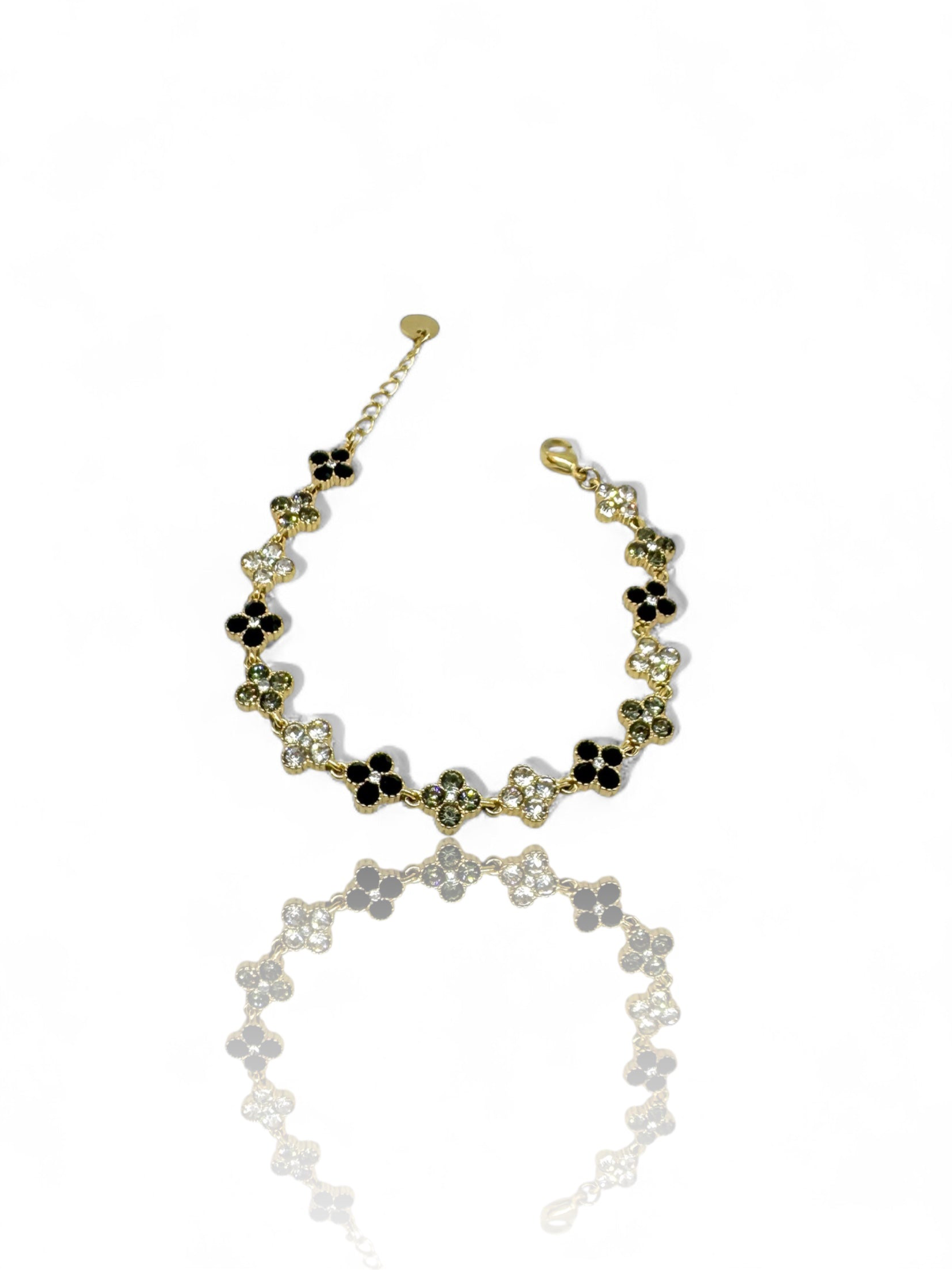 Questo bracciale è elegante e raffinato, realizzato con una catena dorata regolabile e arricchito da una sequenza di piccoli fiori a quattro petali. I fiori alternano cristalli luminosi e smalti neri, creando un piacevole contrasto che unisce luce e profondità. La chiusura regolabile permette di adattarlo facilmente al polso Un gioiello che unisce delicatezza e carattere, perfetto per dare un tocco sofisticato a qualsiasi outfit.