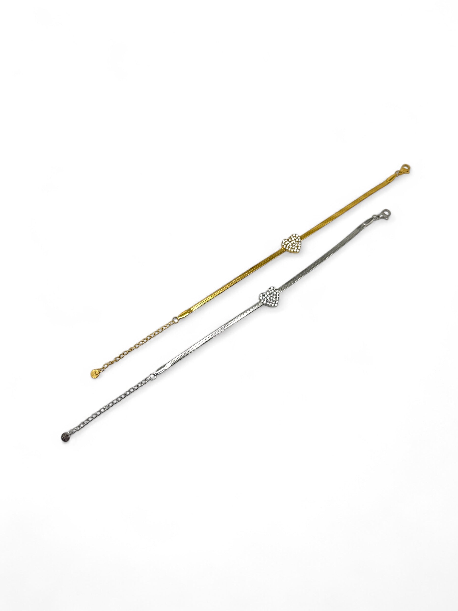 Un bracciale elegante e luminoso che racchiude un messaggio d’amore eterno. Realizzato con una catena a maglia serpente in acciaio anallergico, disponibile nelle versioni oro e argento, è impreziosito da un cuore centrale tempestato di zirconi che cattura la luce ad ogni movimento.