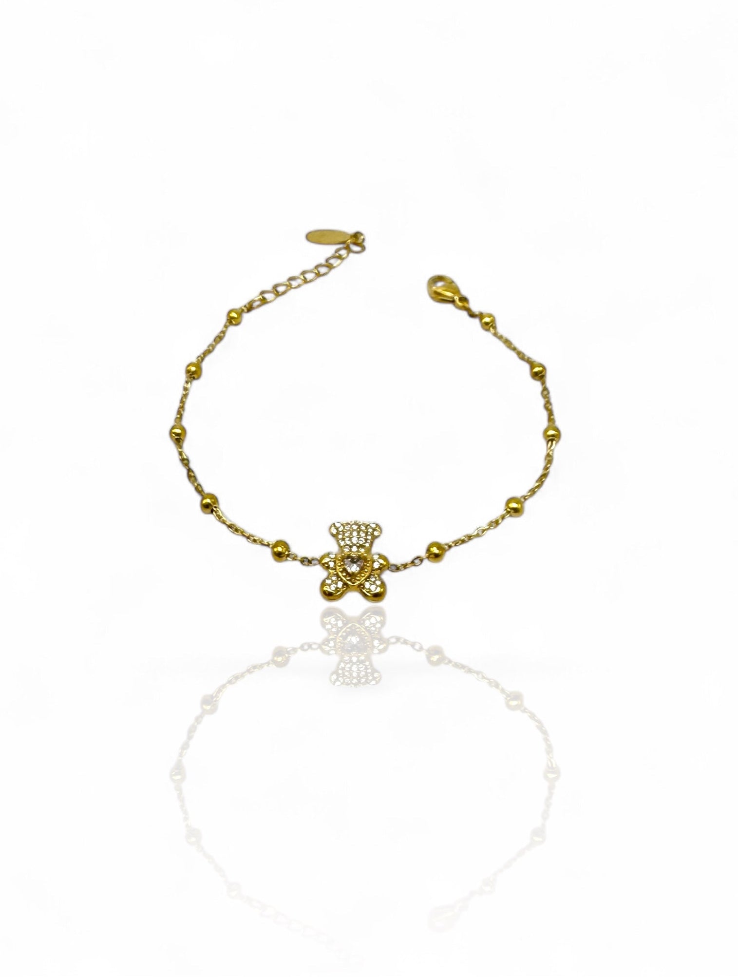 La catena sottile è arricchita da piccole sfere dorate che donano luce e movimento, mentre il Teddy centrale, tempestato di micro cristalli, cattura lo sguardo con un tocco prezioso e raffinato.