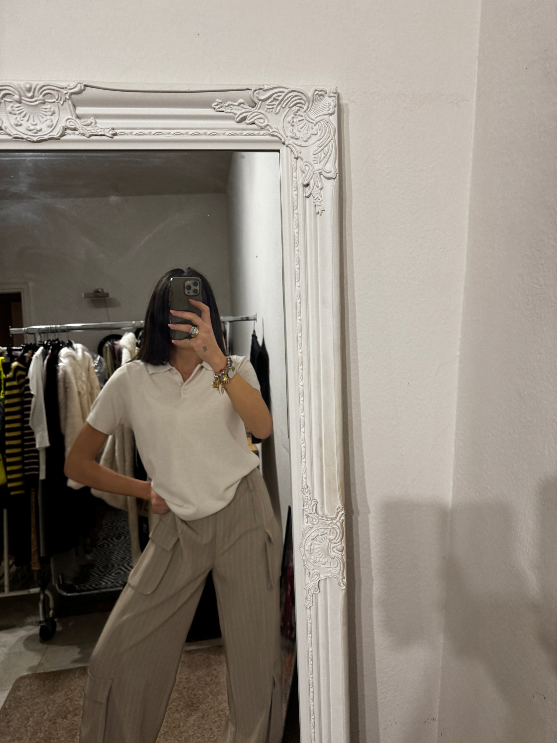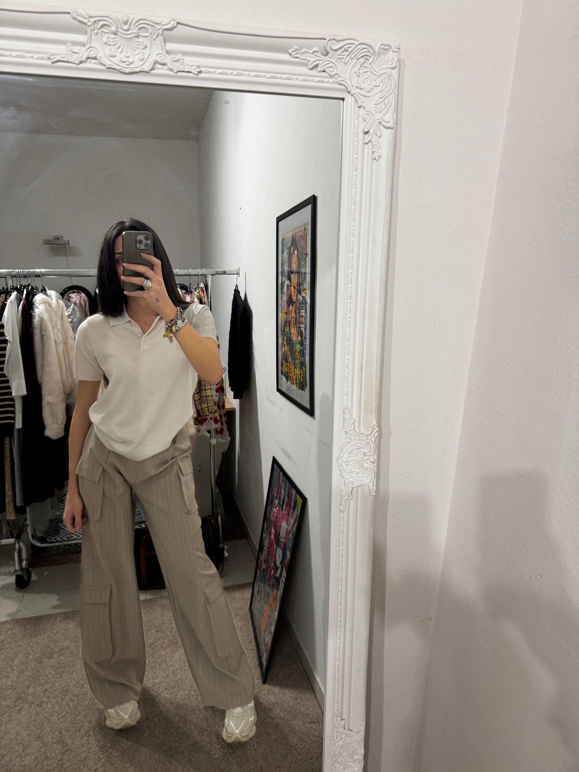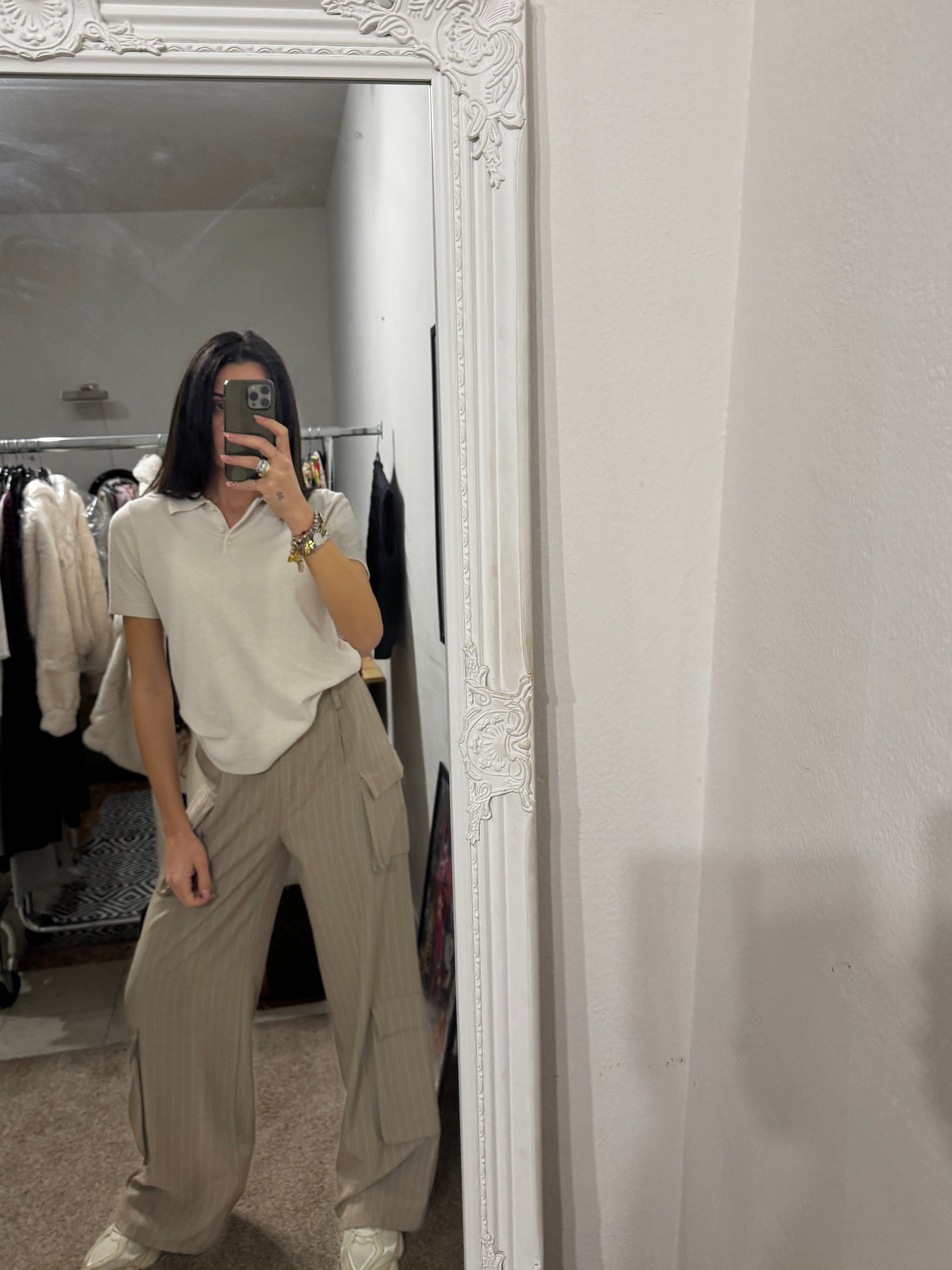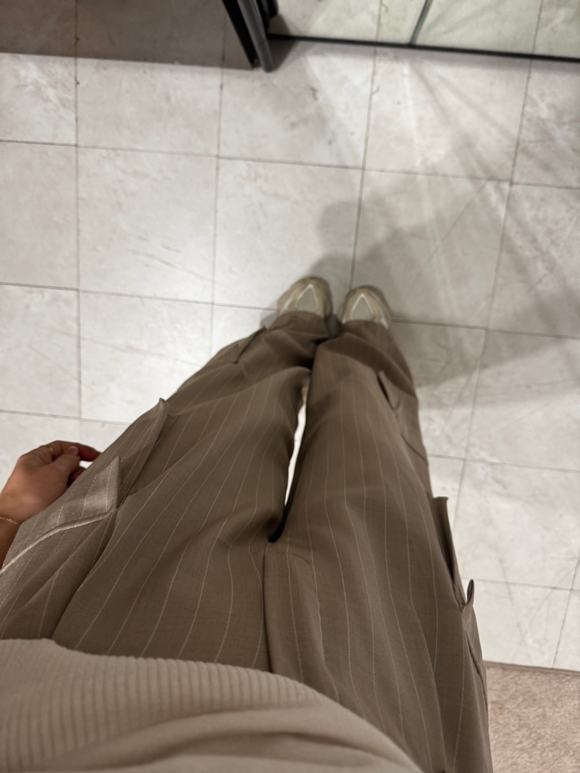 Pantalone cargo dal design contemporaneo, realizzato in tessuto gessato color sabbia. Il taglio ampio e dritto garantisce comfort e una vestibilità fluida, valorizzando la silhouette. Le tasche laterali applicate richiamano lo stile utility, mentre la linea pulita e sartoriale lo rende elegante e versatile.