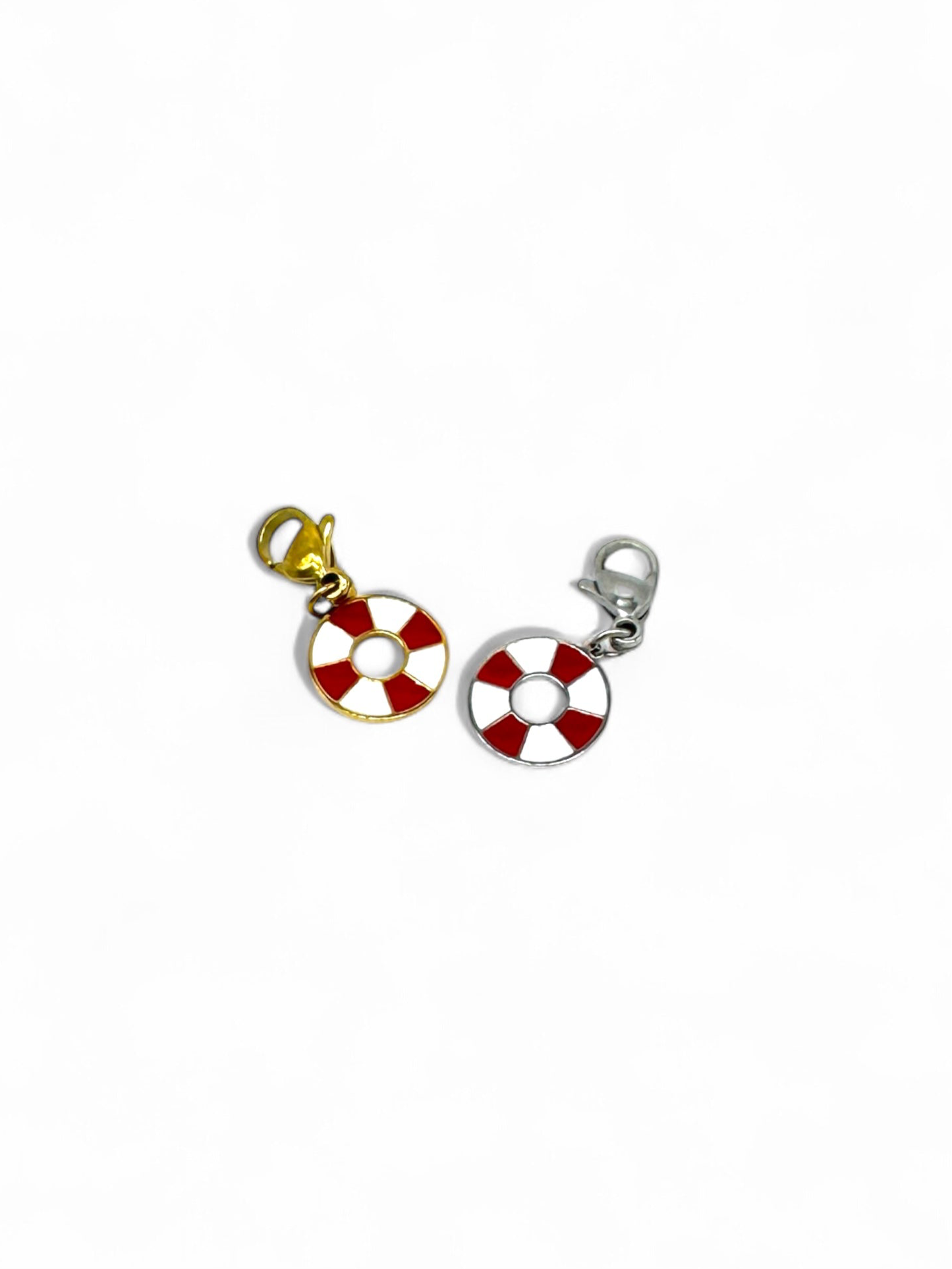 “SOS Estate” è un ciondolo smaltato a forma di salvagente nei classici colori bianco e rosso, disponibile con finitura oro o argento. Un dettaglio ironico e nostalgico, perfetto per chi ama lo stile navy o vuole portare un pizzico d’estate sempre con sé.