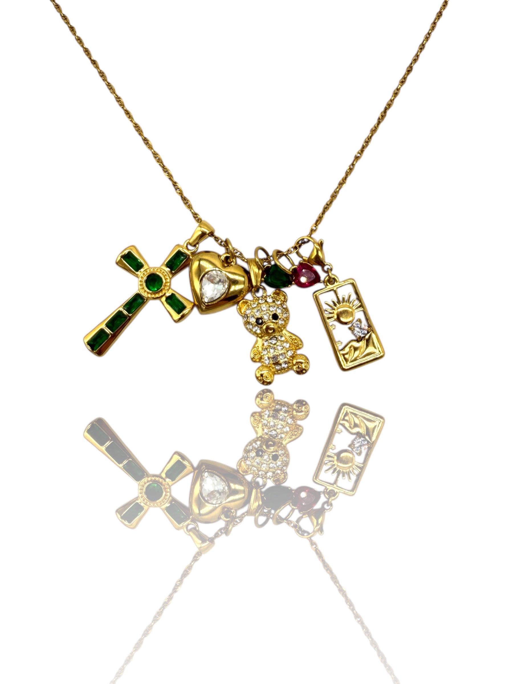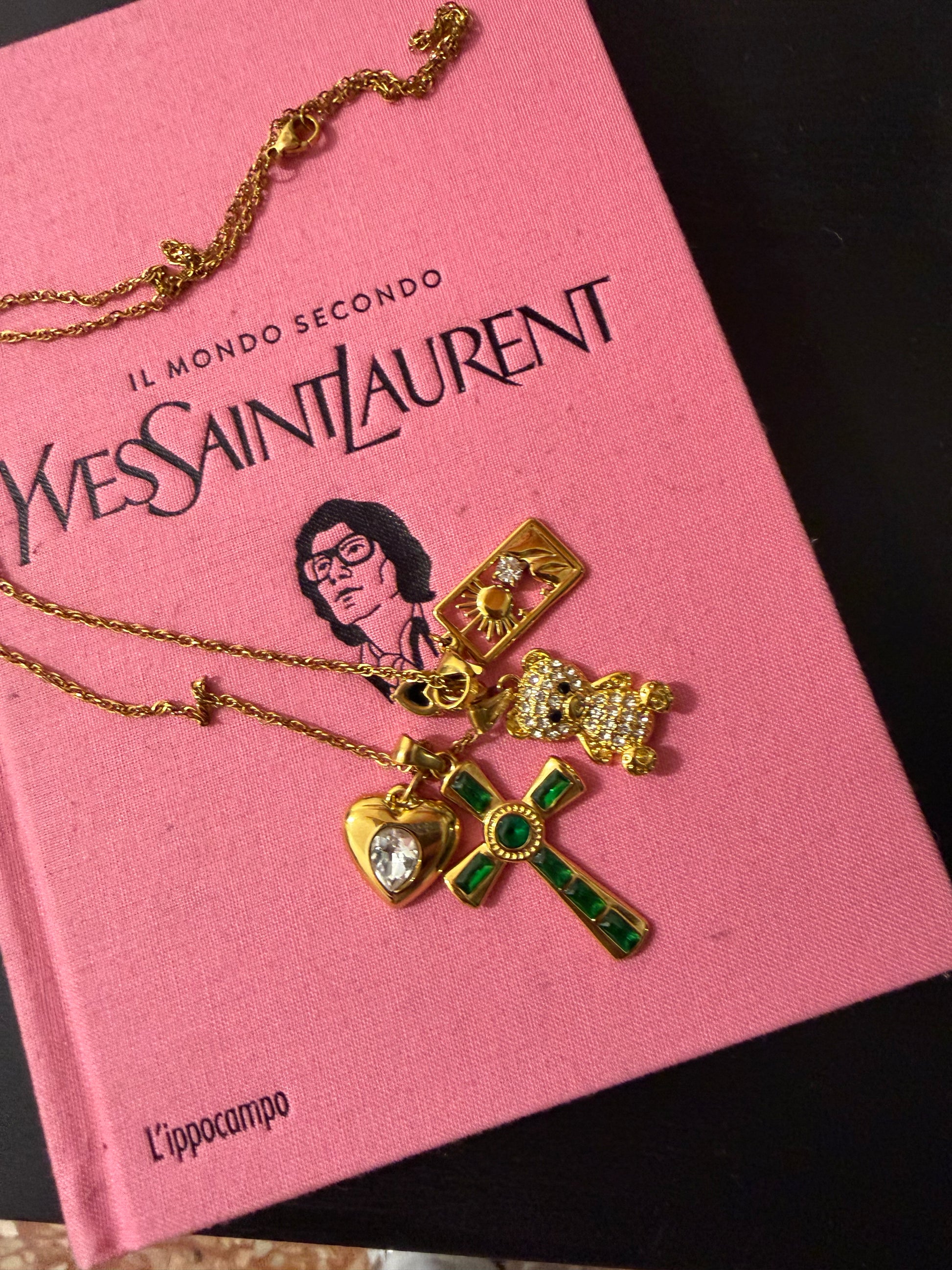 Il verde, colore dell’amore e della rinascita, si intreccia con dettagli dorati che illuminano ogni charm. La croce con pietre verdi rappresenta protezione e forza, mentre il cuore con punto luce custodisce l’essenza dei sentimenti più profondi.