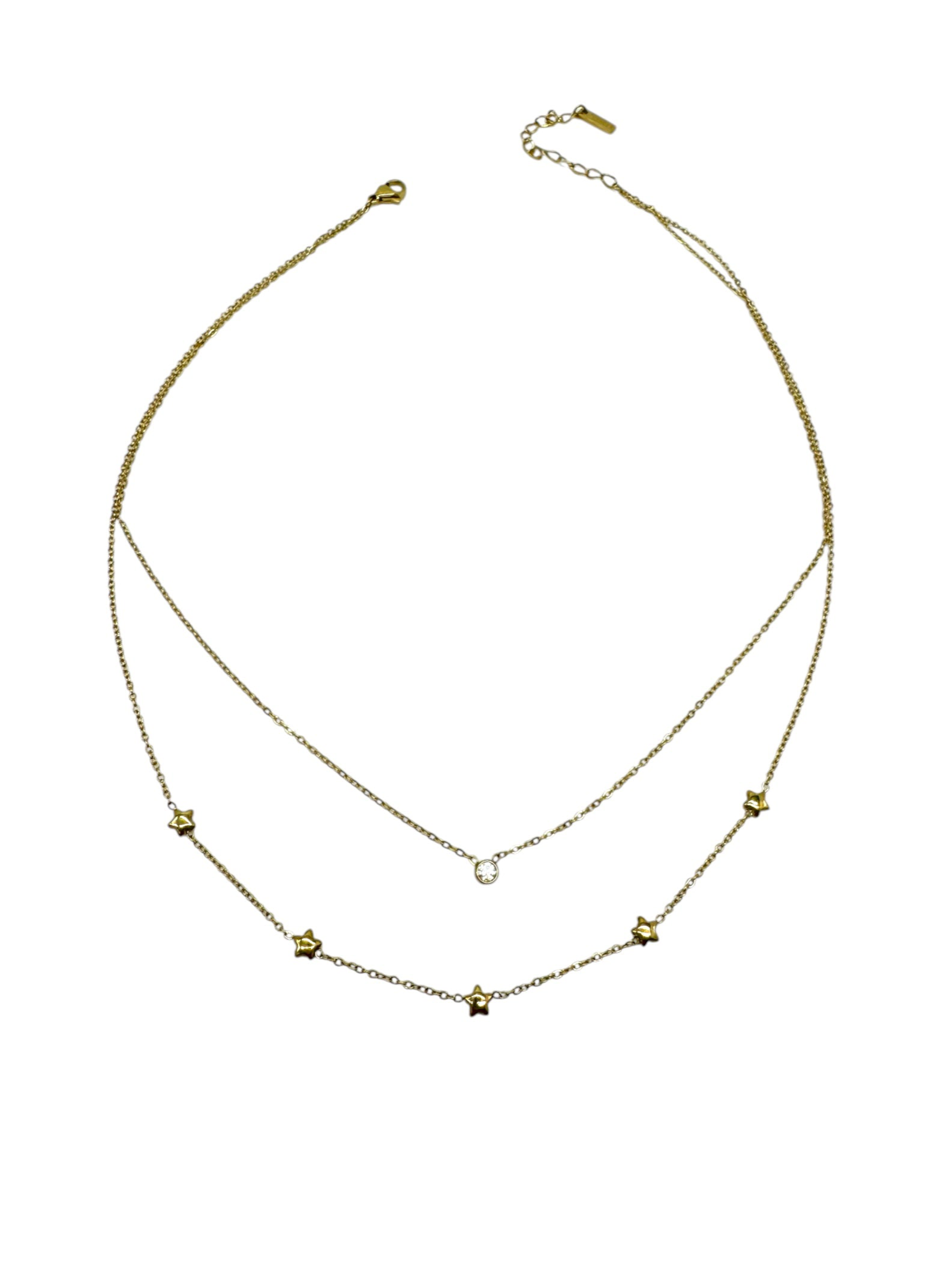 La più lunga è impreziosita da piccoli charm a forma di stelle dorate, distribuite in modo equilibrato lungo la catena.