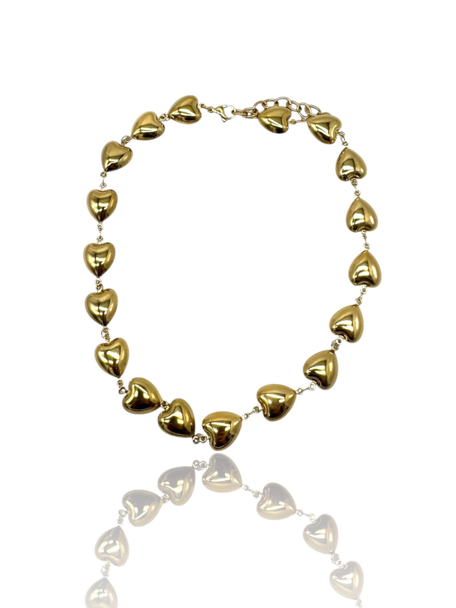 Una sequenza di cuori pieni, lucidi, dorati, uniti tra loro come piccoli battiti che si rincorrono. Ogni cuore riflette la luce creando un effetto elegante, deciso, importante.