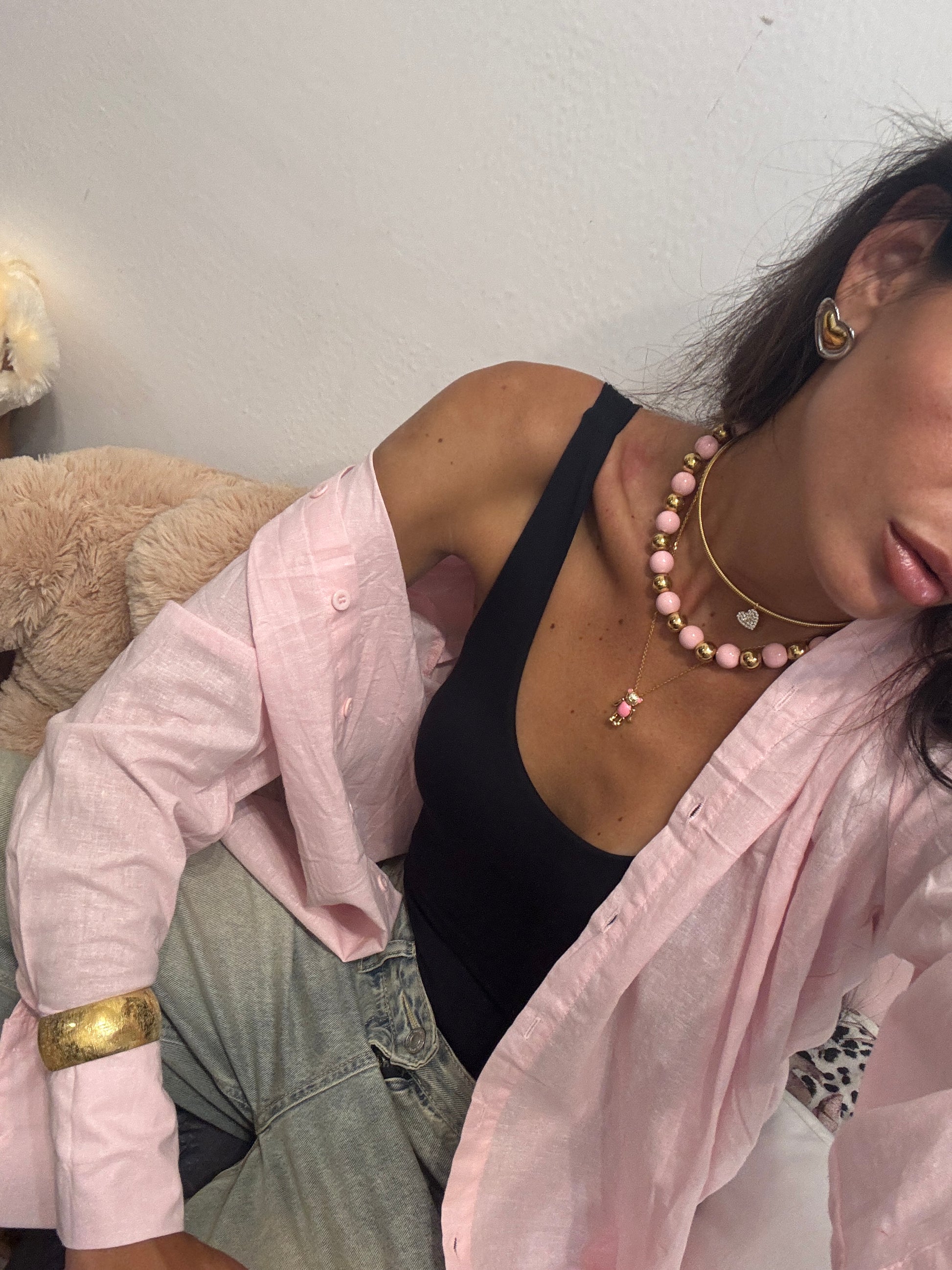 Questa collana è caratterizzata da un ciondolo a forma di orsetto, con dettagli moderni e giocosi. L’orsetto è realizzato in ottone galvanizzato, con inserti decorativi in rosa smaltato per il corpo e le orecchie. La testa è ornata con piccoli cristalli o dettagli scintillanti che aggiungono un tocco di eleganza al design. La catenina, fine e minimalista, completa il look donando un equilibrio tra semplicità e stile.