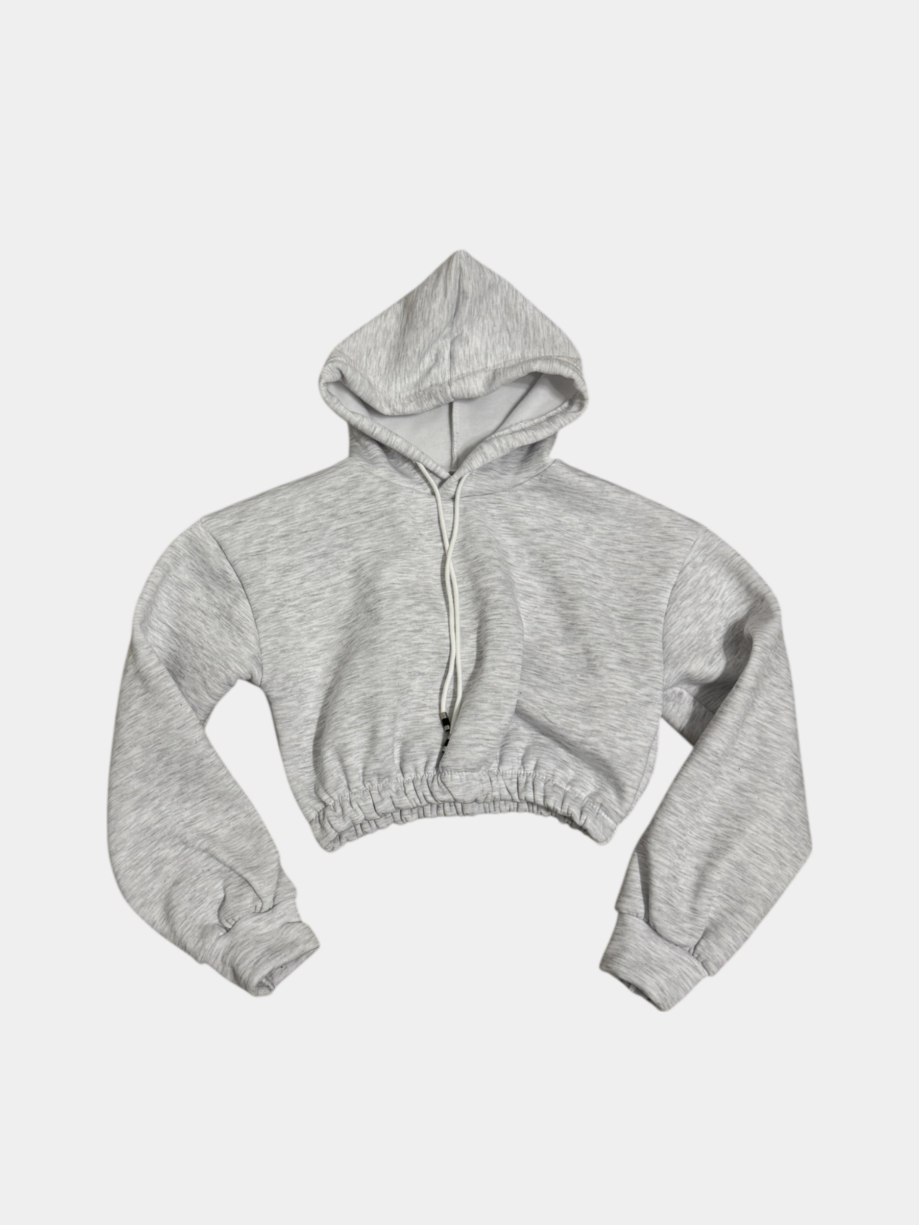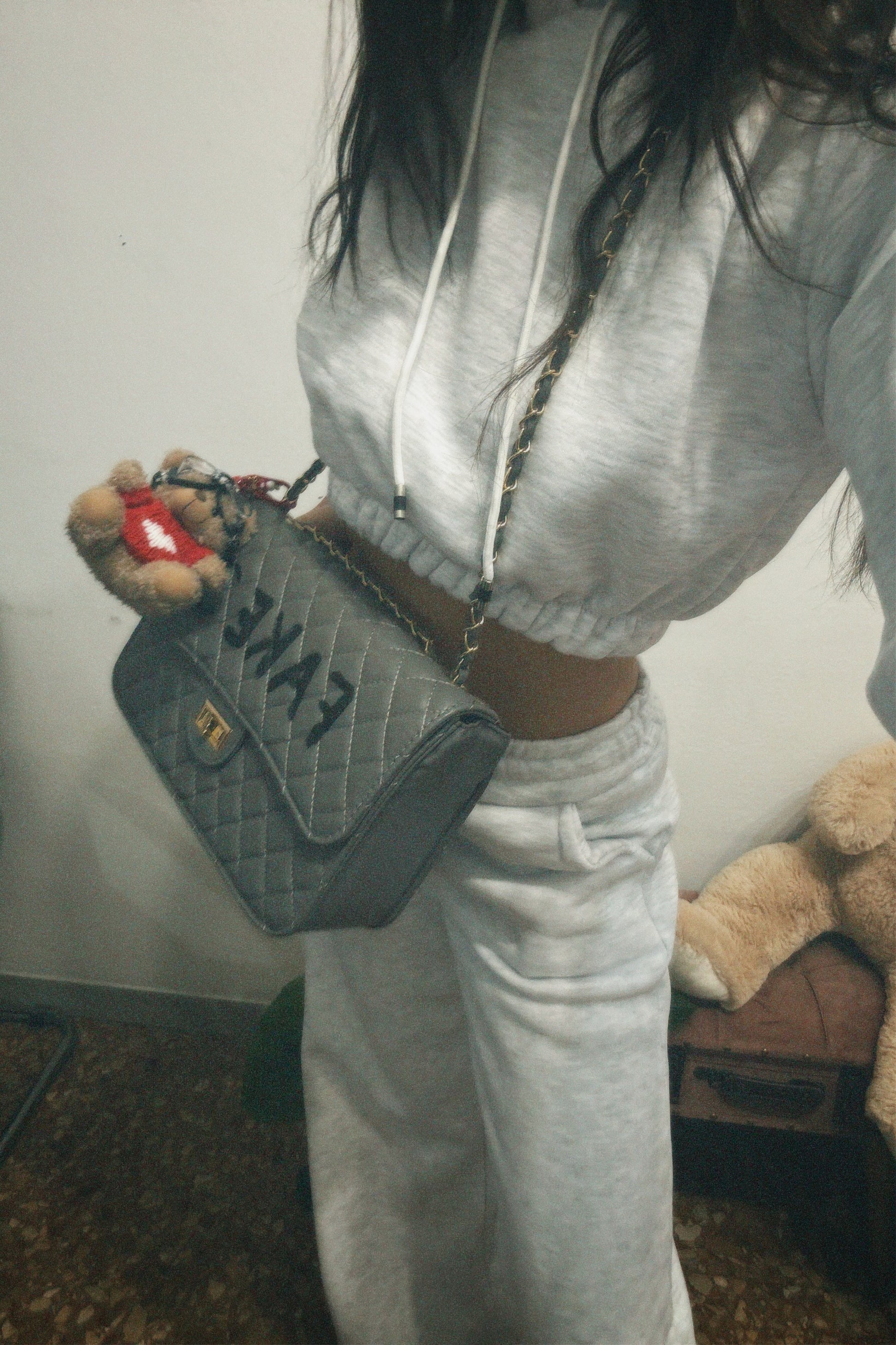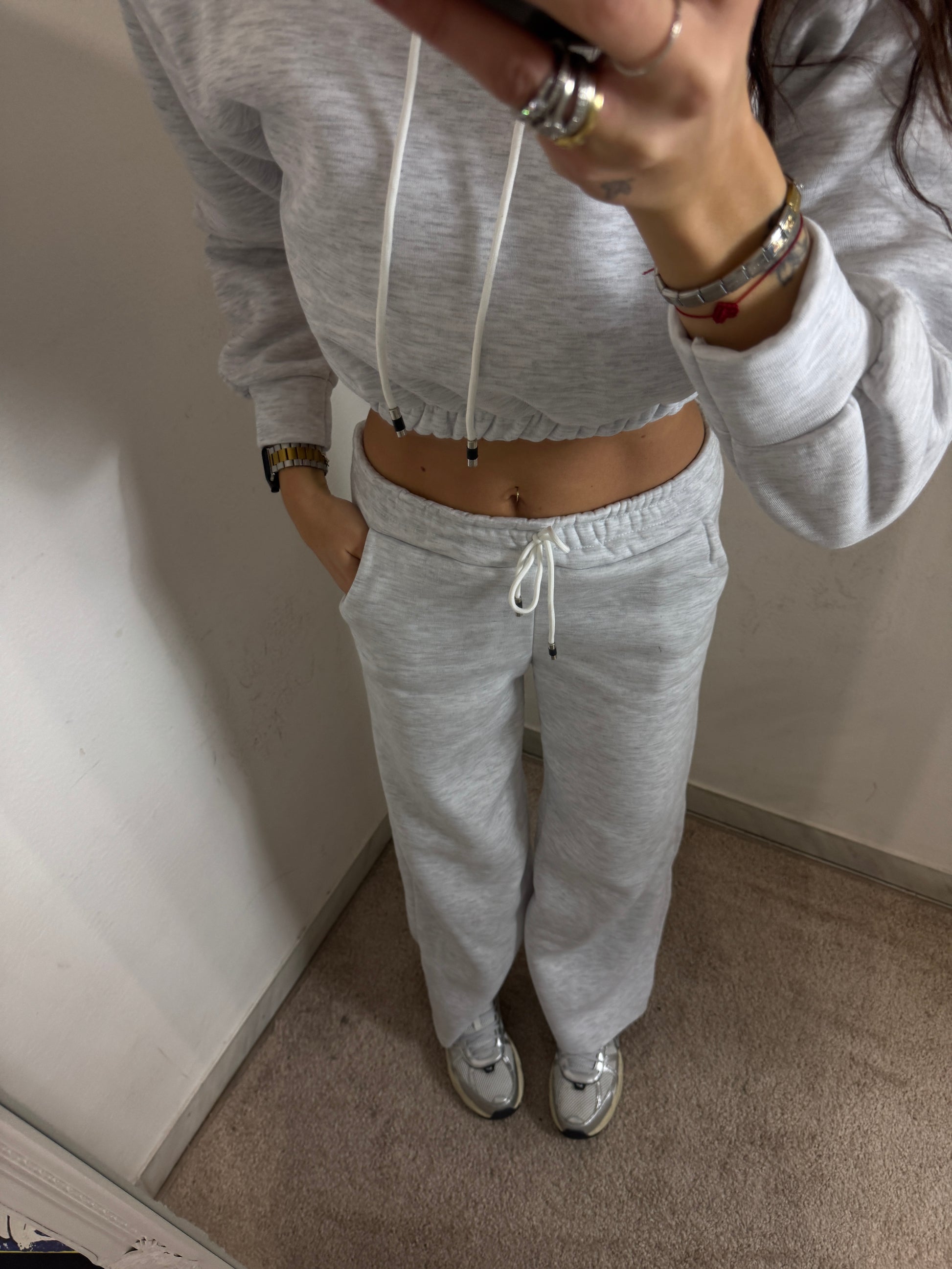 La felpa crop con cappuccio valorizza il punto vita grazie all’elastico morbido sul fondo, mentre il pantalone a vita alta, dal fit rilassato e scivolato, accompagna le forme senza costringere.