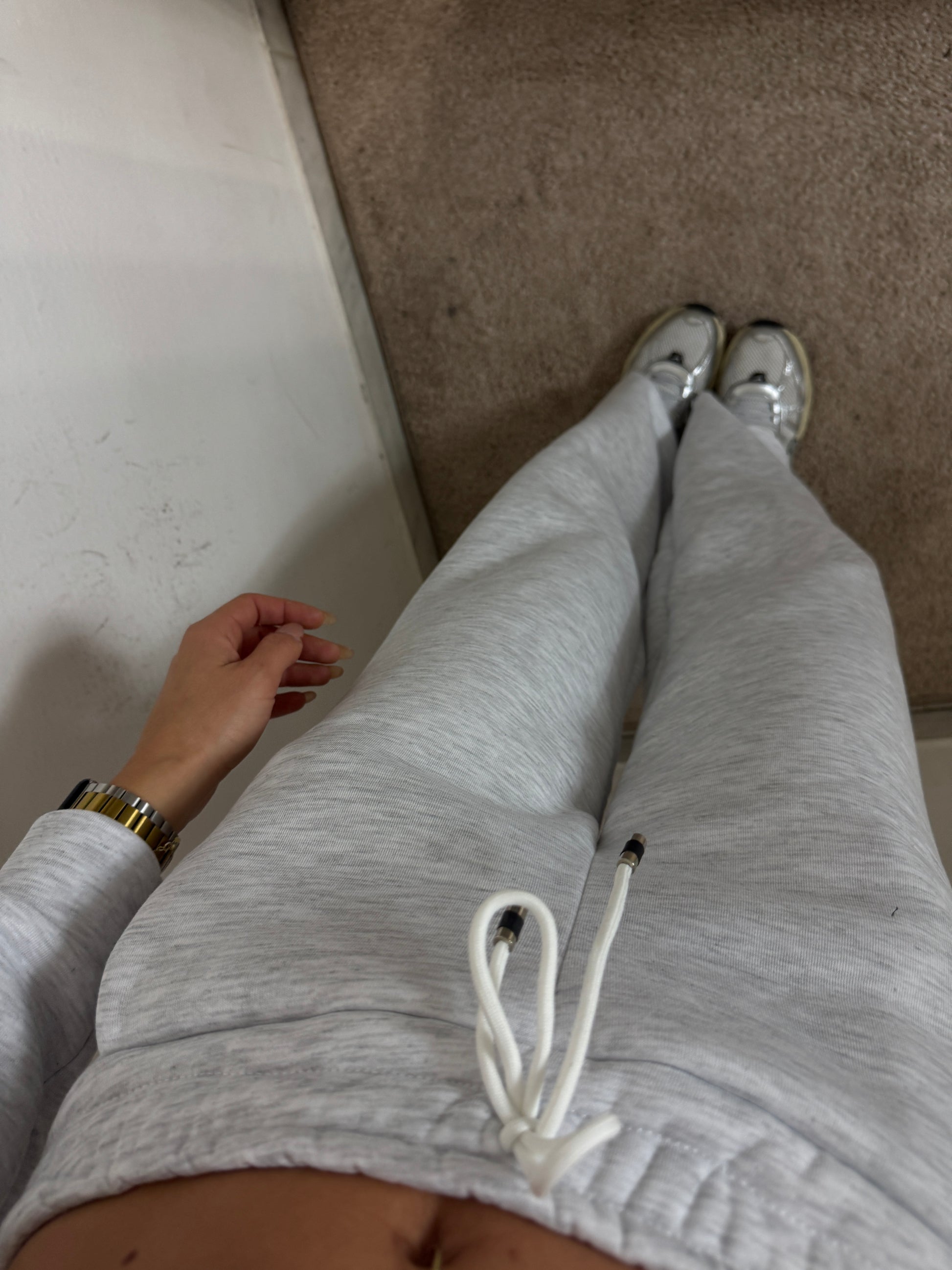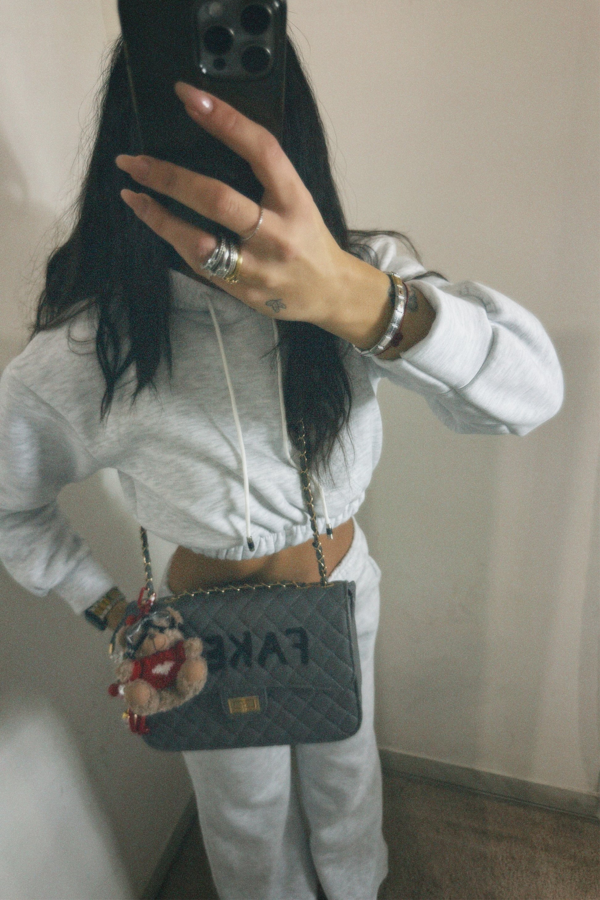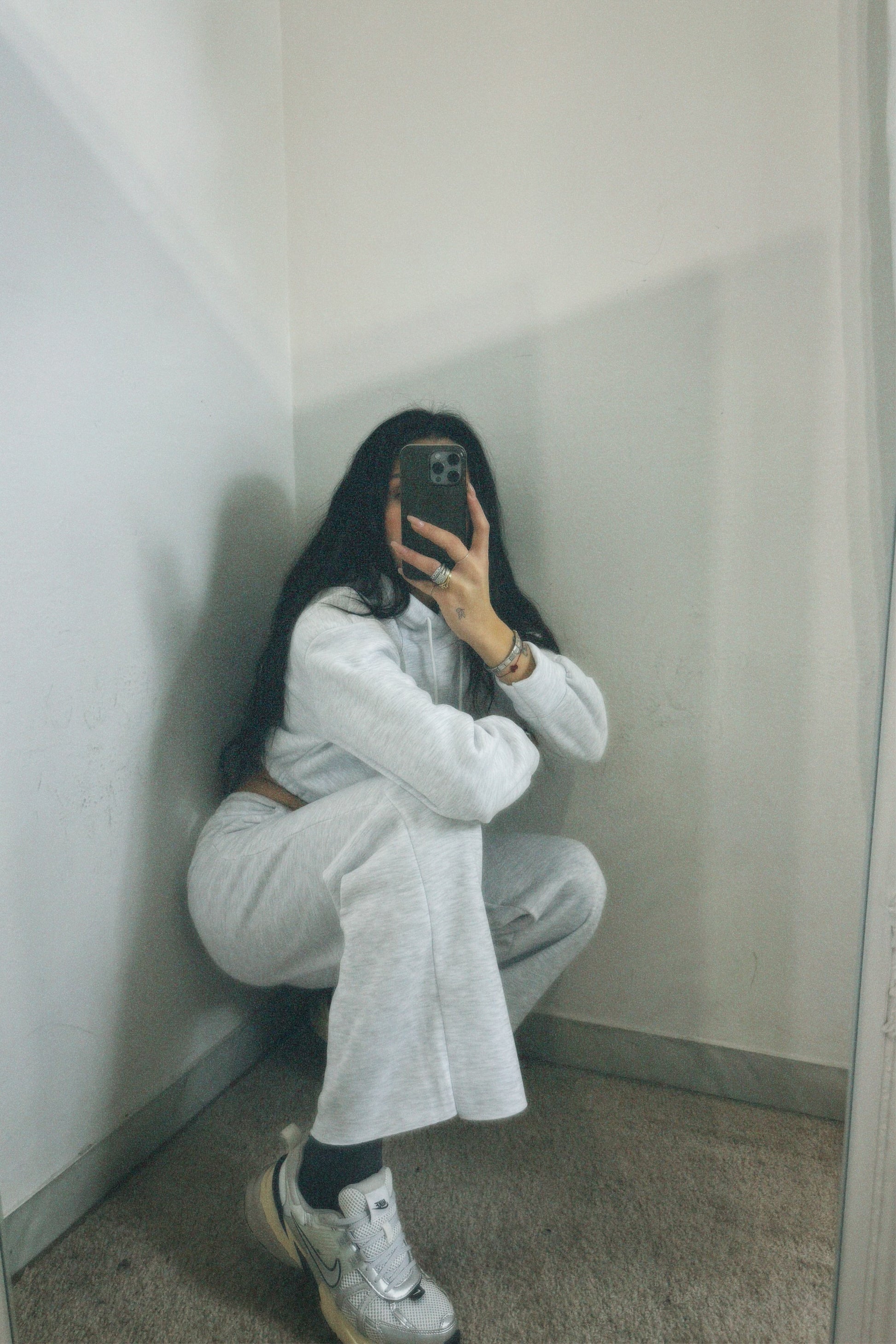 La felpa crop con cappuccio valorizza il punto vita grazie all’elastico morbido sul fondo, mentre il pantalone a vita alta, dal fit rilassato e scivolato, accompagna le forme senza costringere.