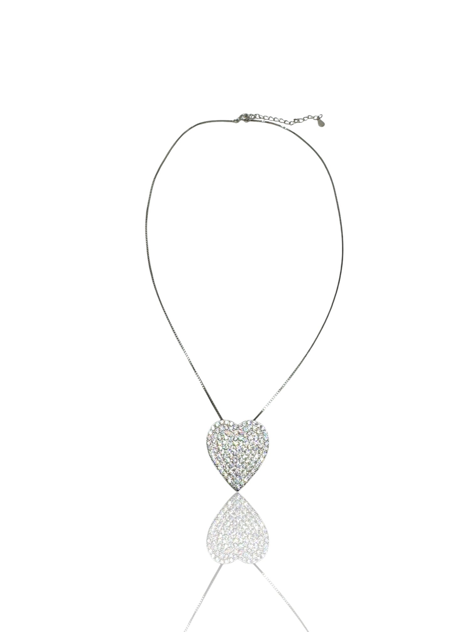 Un gioiello luminoso ed elegante che cattura ogni sguardo. La catena sottile in argento 925 sorregge un pendente a forma di cuore, completamente ricoperto da una fitta pavé di zirconi scintillanti.