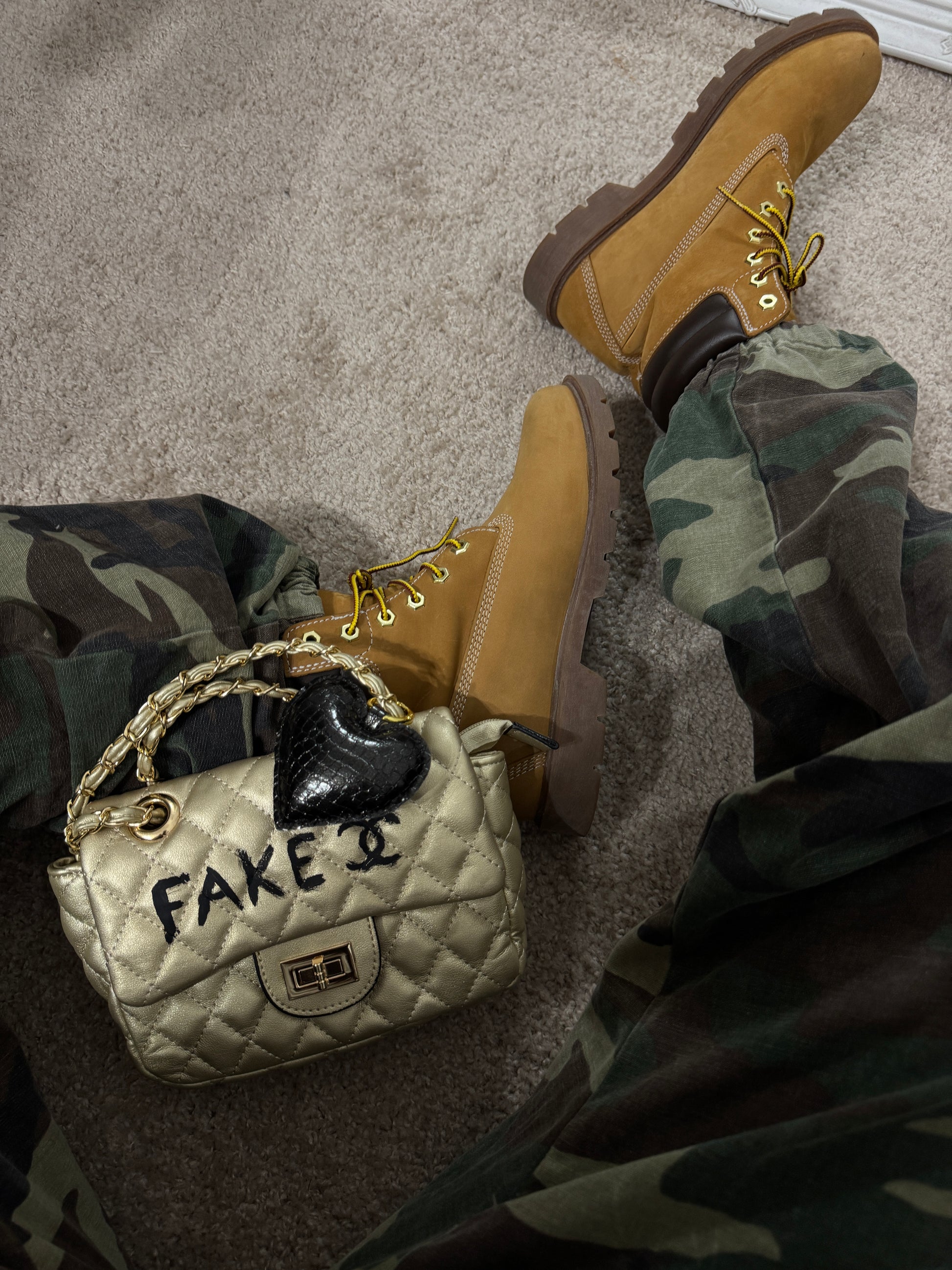 La patta frontale è personalizzata con la scritta “FAKE” dipinta a mano e con il logo reinterpretato, per uno stile ironico, provocatorio e super contemporaneo.
