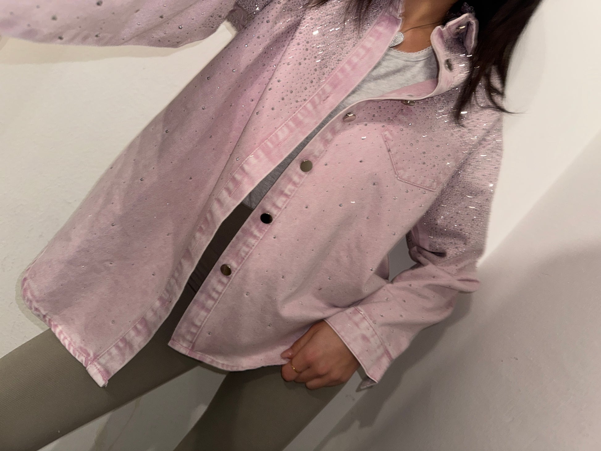 Camicia dal carattere luminoso e delicato, realizzata in denim rosa sfumato e arricchita da micro applicazioni brillanti distribuite su tutta la superficie.
