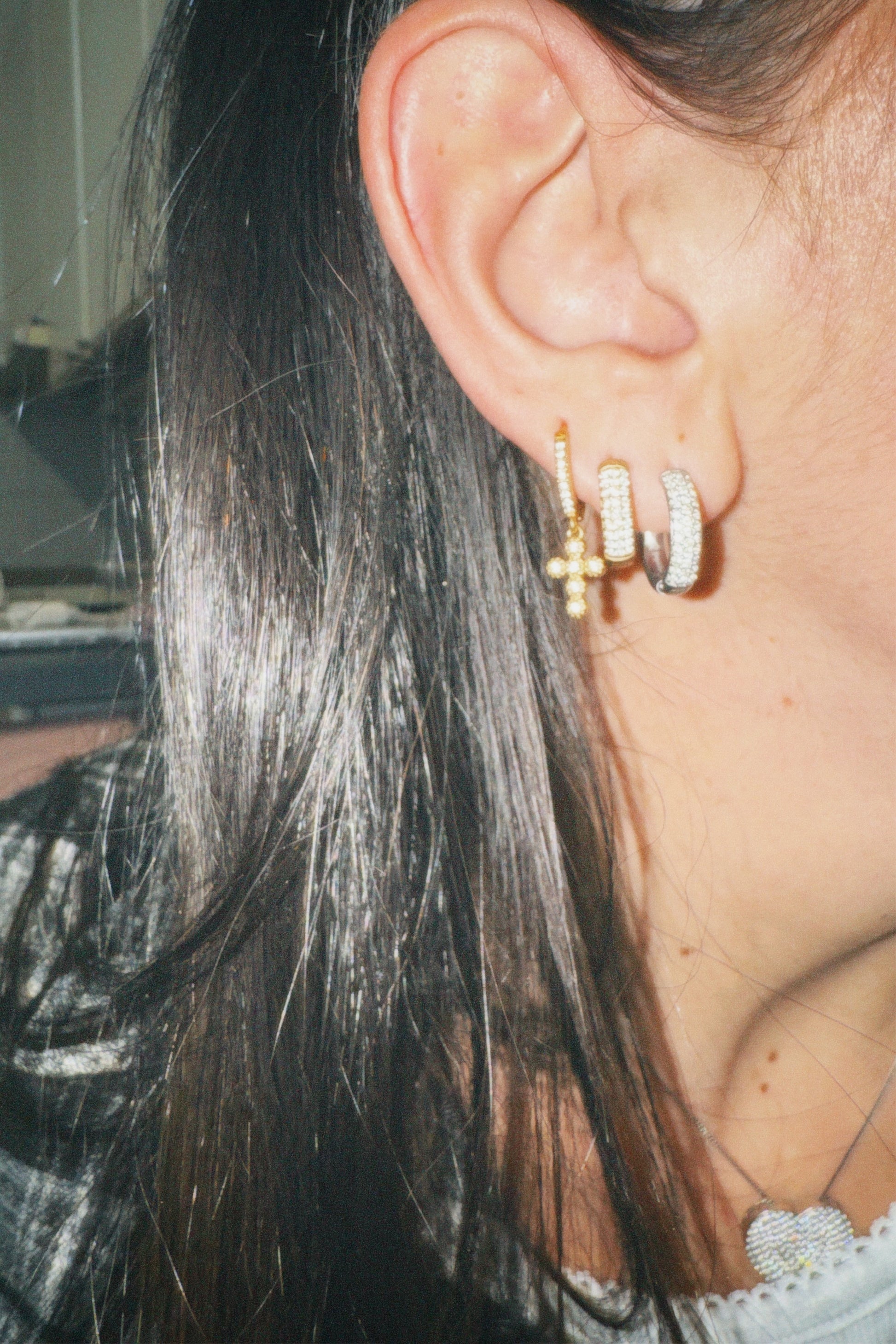 Le croci sono impreziosite da piccoli zirconi che donano brillantezza e raffinatezza, mentre il cerchietto decorato completa il gioiello con un tocco sofisticato.