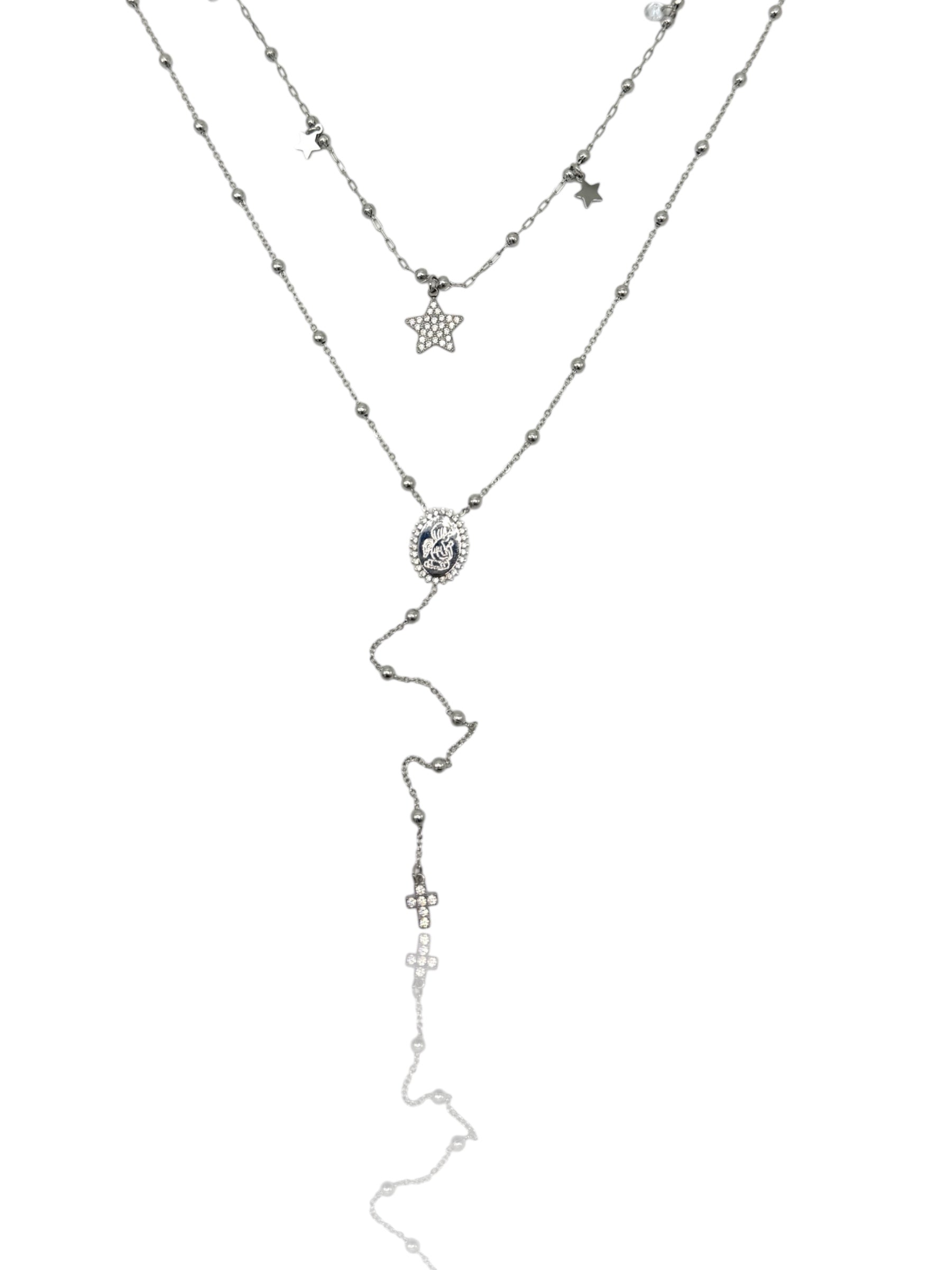Rosario dorato con perline sottili, ciondolo ovale raffigurante un angelo e croce finale impreziosita da cristalli. Elegante e simbolico.