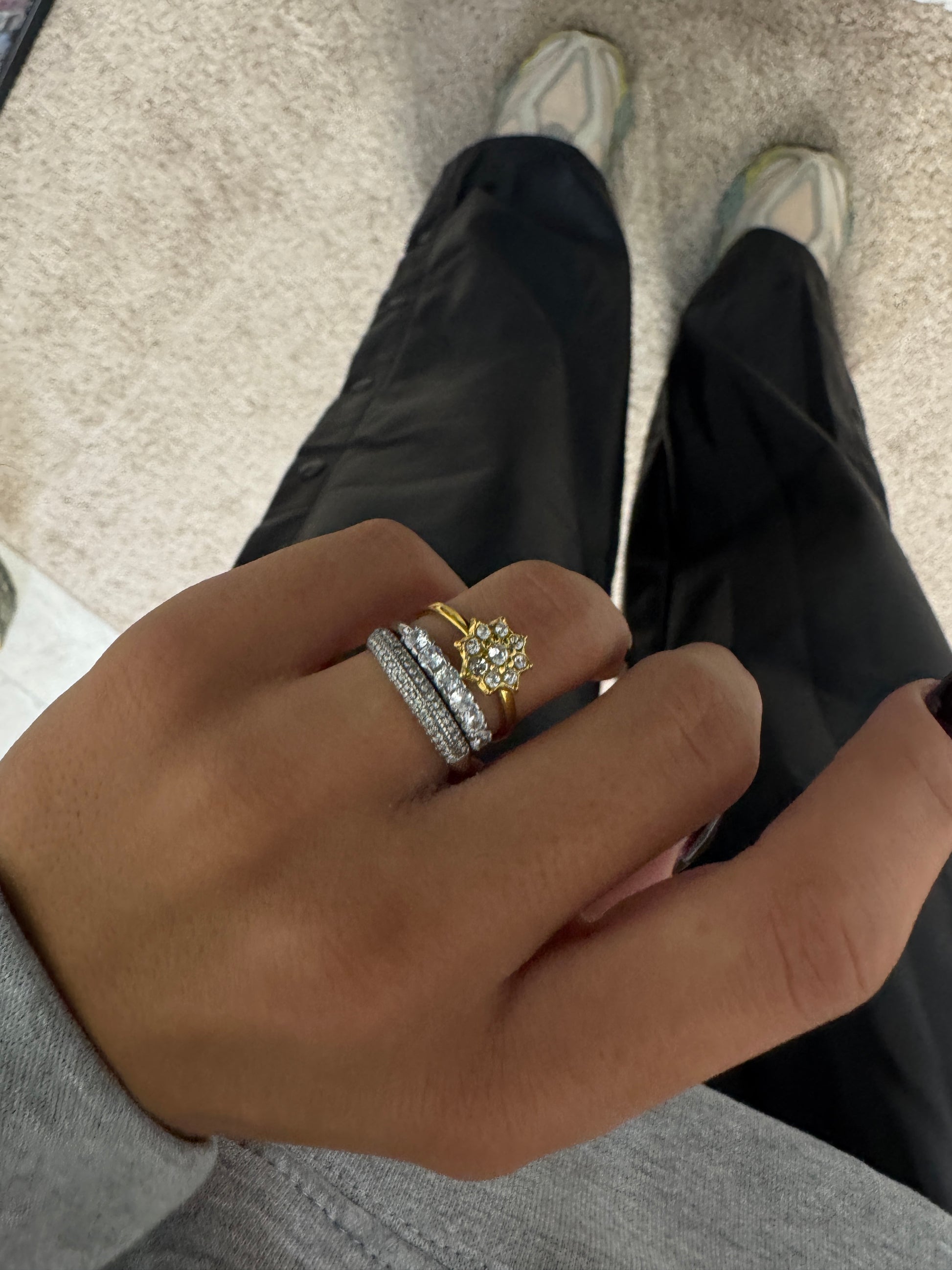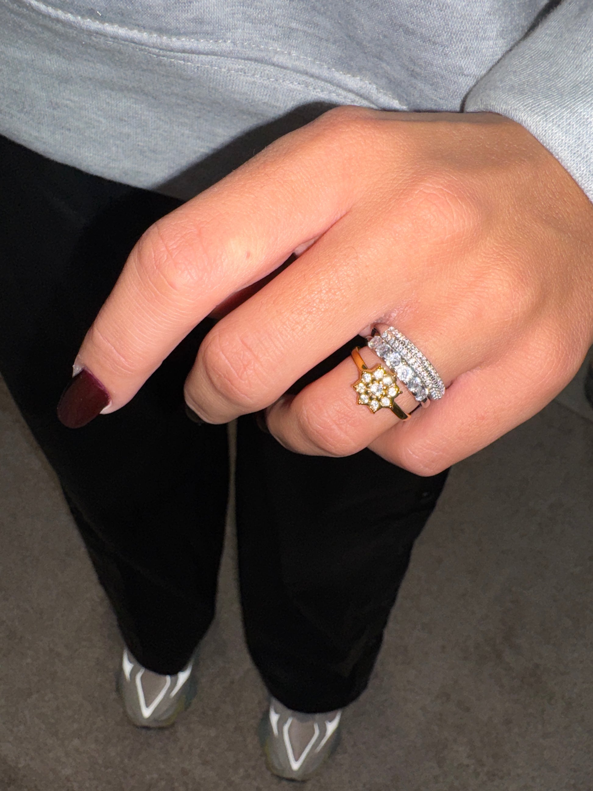 Set di 3 Anelli Regolabili. Un trio luminoso composto da due fasce argento con zirconi e un anello gold con fiore centrale brillante. Indossati insieme creano un effetto prezioso e sofisticato, perfetto per illuminare ogni look.