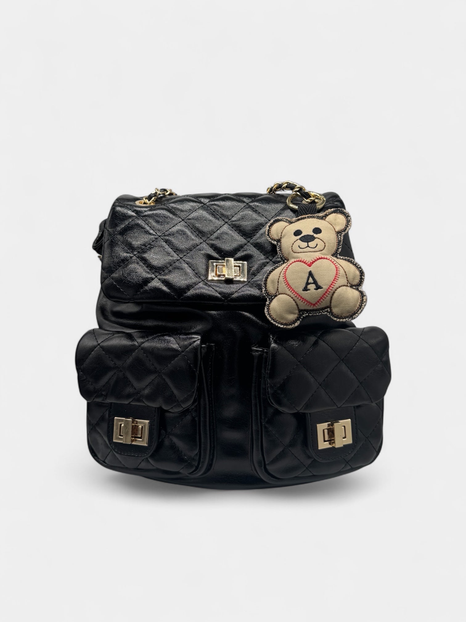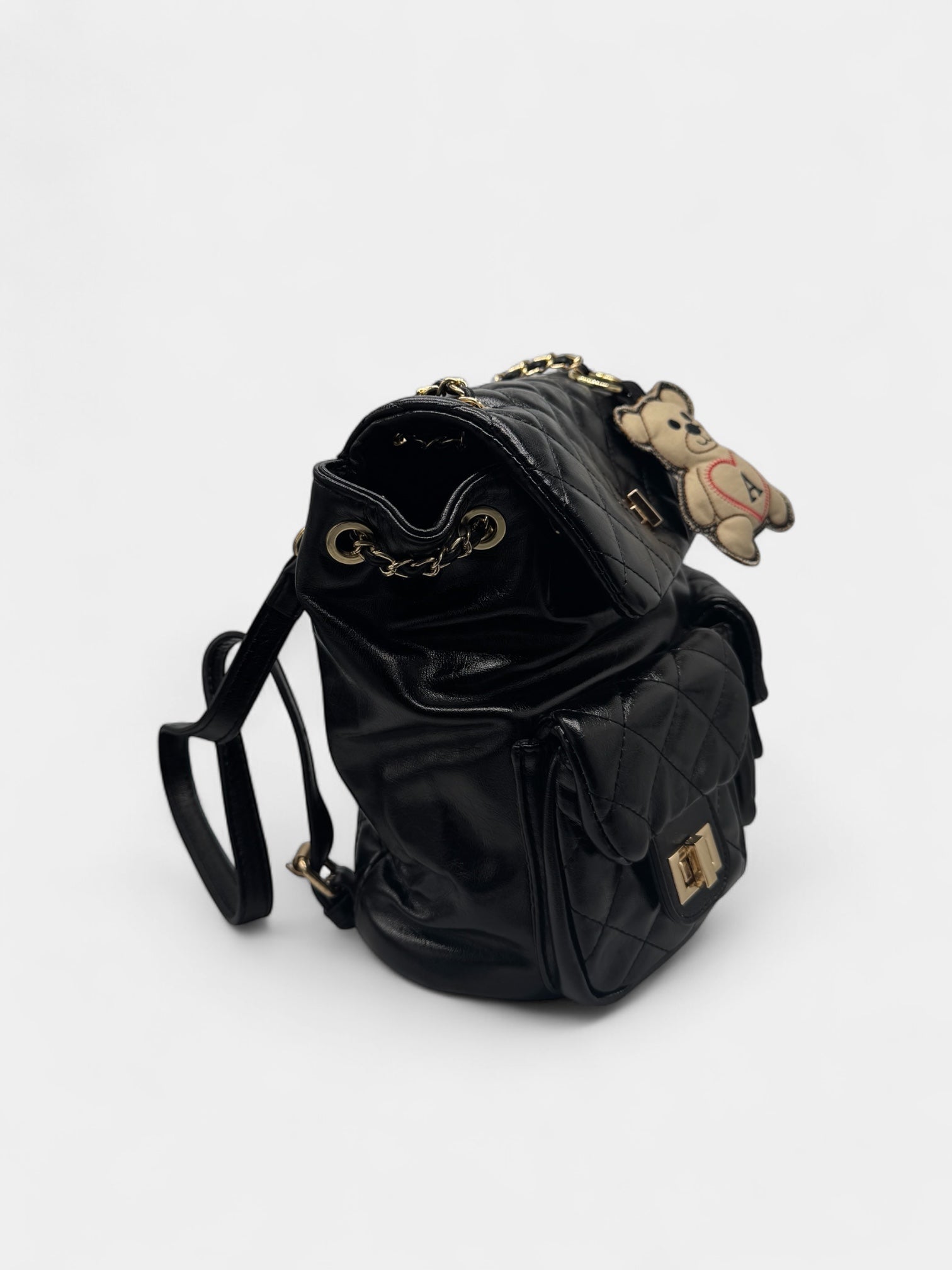 Zaino in ecopelle nera con lavorazione matelassé. Elegante e funzionale, ideale per tutti i giorni. Chiusura patta con girello in metallo dorato.